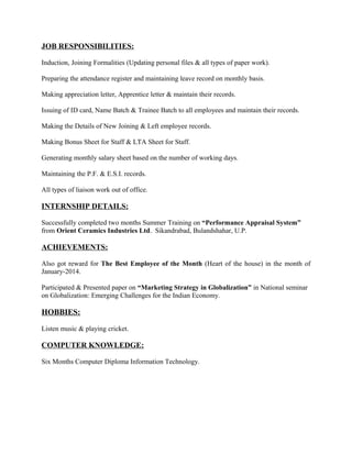 Manish Kumar Jaiswal is currently working as an HR Assistant at Hotel Ramada Plaza JHV Windham Group in Varanasi, India. He has a MBA from Veer Bahadur Singh Purvanchal University Jaunpur and relevant work experience in HR. His responsibilities include induction procedures, maintaining employee records, generating salary sheets, and liaising within and outside the organization. He has completed internships and computer training and enjoys listening to music and playing cricket in his free time.