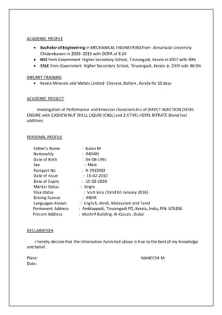This resume summarizes Maneesh M's qualifications and experience as a Mechanical Engineer seeking a position in Dubai. He has 1 year and 4 months of experience in mechanical engineering working for Kerala Clay and Ceramic Products, including operating and maintaining water purification plants. Maneesh holds a Bachelor's Degree in Mechanical Engineering from Annamalai University with excellent academic performance. He has skills in AutoCAD, Pro-E and MS Office as well as strong communication and leadership abilities.