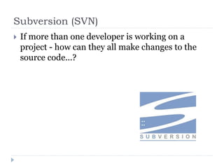 This document provides an overview of Apache build tools including Subversion (SVN), Apache Ant, and Apache Maven. It discusses how SVN allows multiple developers to work on the same project files, the purpose of version control, and some SVN terminology. It then explains how Ant is used to automate software build processes using XML scripts and targets. Finally, it outlines the conventions and lifecycle of Maven projects including dependencies, plugins, repositories, and releasing projects.
