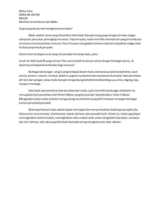 Madu memiliki manfaat kesehatan yang signifikan, termasuk sebagai obat herbal untuk menyembuhkan berbagai penyakit dan meningkatkan stamina tubuh. Kandungan gizi dalam madu meliputi karbohidrat, asam amino, dan zat antibiotik yang dapat melawan kuman penyakit. Konsumsi madu secara teratur dapat membantu mencegah dan menyembuhkan penyakit seperti batuk, demam, dan penyakit kulit.