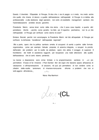 L'autrice racconta la sua esperienza di ricovero all'ospedale di Perugia, evidenziando la mancanza di posti letto e le condizioni indecenti in cui si è trovata, costretta a ricevere cure in corridoio. Nonostante la professionalità del personale, critica il management sanitario per la gestione inefficace delle risorse e auspica un intervento politico per migliorare la situazione. Conclude sottolineando la necessità di una maggiore attenzione alla qualità dell'assistenza sanitaria da parte delle autorità.