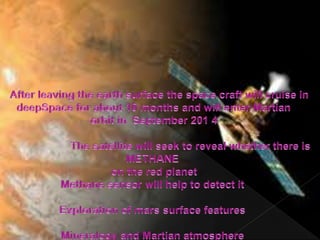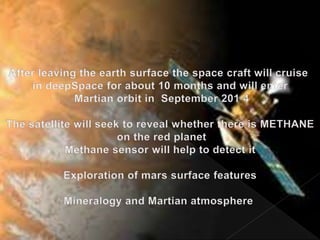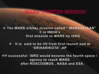 India's first mission to Mars called Mangalyaan is set to launch from Sriharikota, Andhra Pradesh. If successful, the Mars Orbiter Mission approved in August 2012 for $69 million would make ISRO the fourth space agency to reach Mars, following projects from Russia, NASA, and ESA. The spacecraft shares features with India's previous Chandrayaan-1 moon mission.