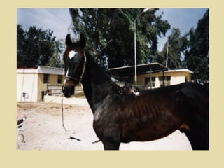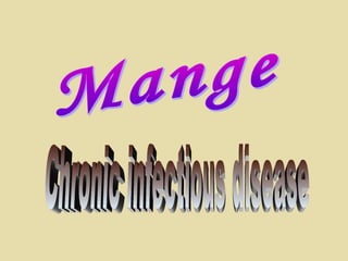 There are several species of mites that can cause mange in animals, including sarcoptic, psoroptic, and chorioptic mites. Clinical signs of mange include itching, hair loss, redness, scaling, thickened skin, cracks and fissures, and general weakness. Treatment includes injectable ivermectin, topical pesticide sprays, and sulfur ointment applied after removing scales. Atropine may be given if pesticide toxicity occurs.