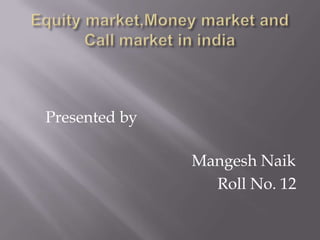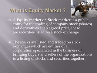 The document discusses equity markets, stock exchanges, and money markets. It provides details on: