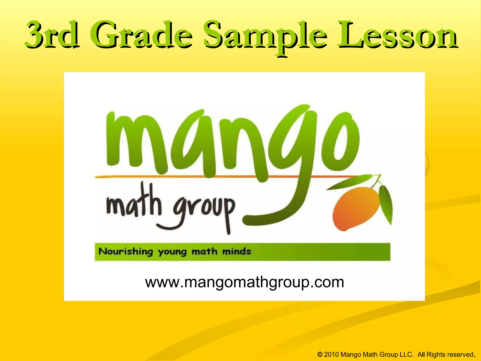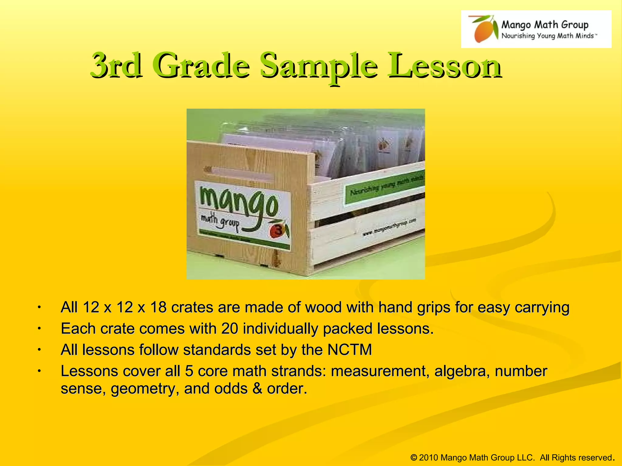 The document outlines a 3rd grade math educational program from Mango Math, featuring 20 lessons that cover key math concepts aligned with NCTM standards. It includes guidelines for hands-on activities, such as the 'Metric Mango Tree' game, designed to enhance students' measurement skills and critical thinking. Feedback from educators highlights the program's effectiveness in engaging students and reinforcing math skills.