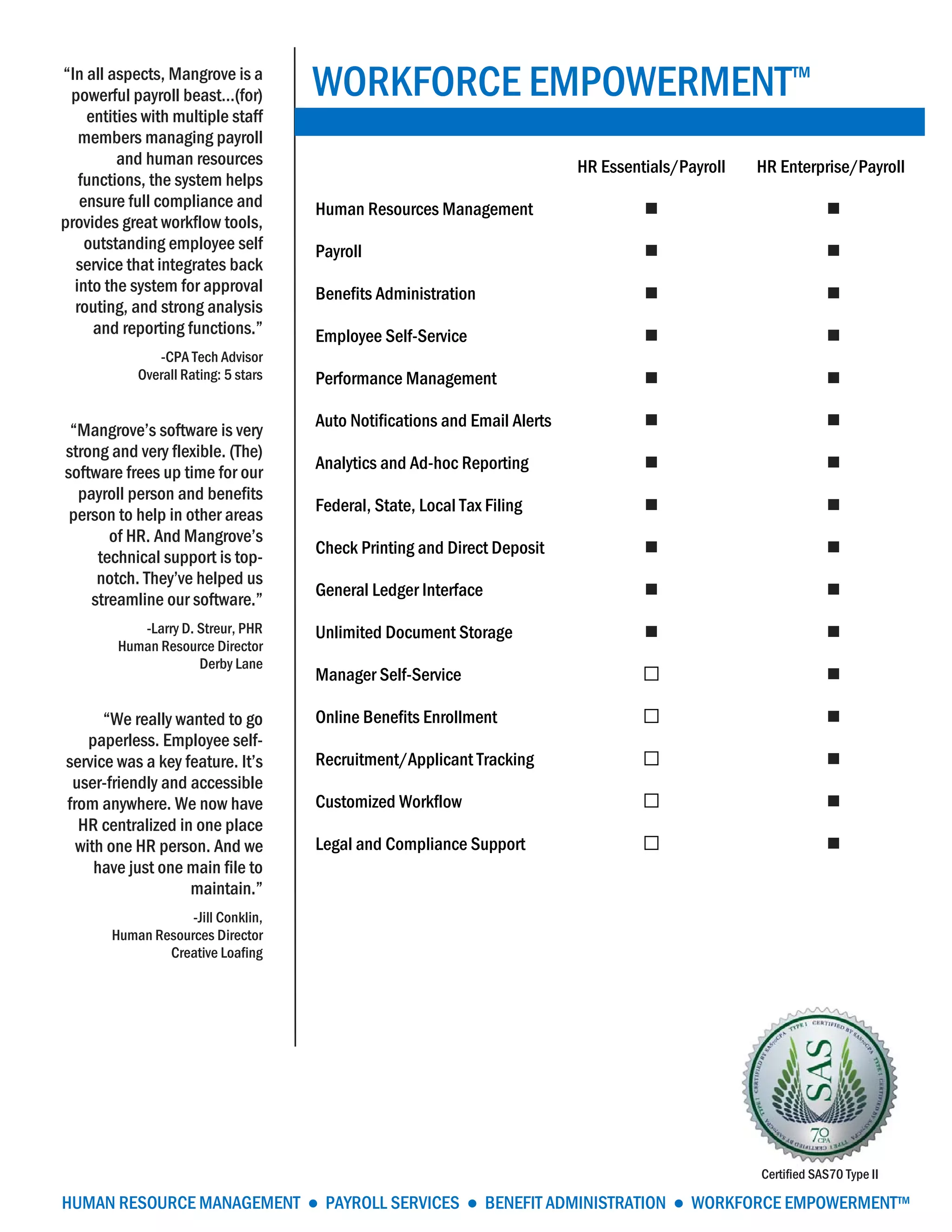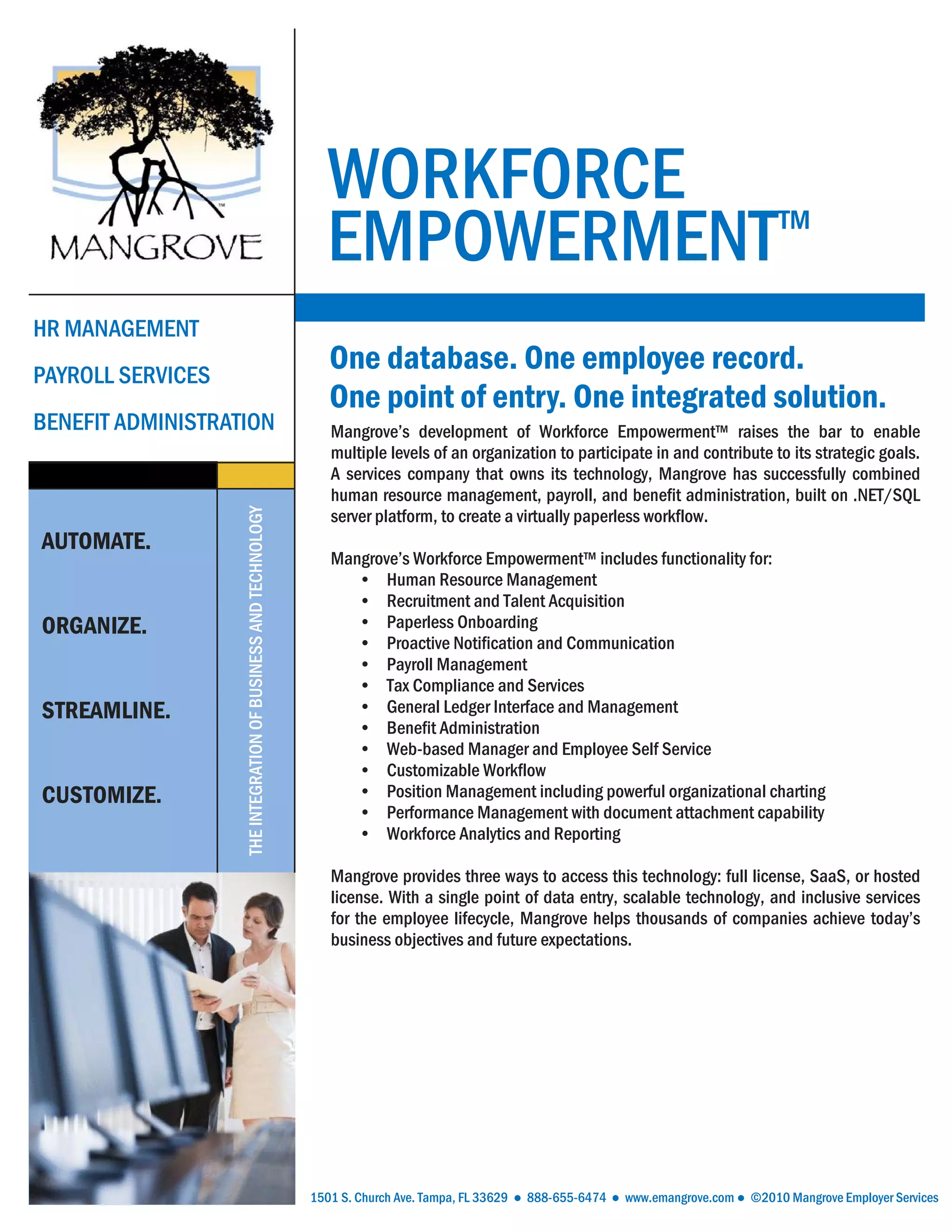 Mangrove provides a fully integrated human resource management, payroll, and benefit administration solution called Workforce Empowerment. The solution allows for a single database, employee record, and point of entry. It also enables multiple levels of an organization to participate in strategic goals. Mangrove owns the technology and has successfully combined HR, payroll, and benefits on a .NET/SQL platform to create a virtually paperless workflow.