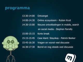 Presentatie als onderdeel van de workshop Online Groei bij Mangrove. Aan de hand van een praktijkcase van Stayokay werden ideeën en inzichten verschaft hoe je het online ecosysteem kunt inzetten voor groei van je organisatie. De workshop werd verzorgd door Ruben Kruit, Stephen Farrelly en Patrick Beeker (Stayokay).