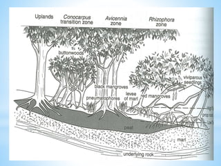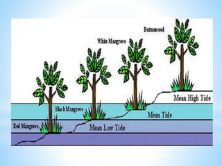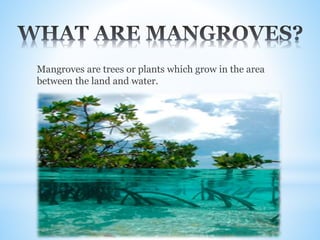 Mangroves are trees or plants that grow between land and sea in coastal tropical and subtropical regions. They have adapted to survive in conditions with high salinity, sedimentation, and tidal flooding. Mangroves form unique ecosystems that provide shelter and food for many species. However, they are being destroyed for activities like urbanization and agriculture. The document provides details on mangrove ecology, distribution, importance and threats.