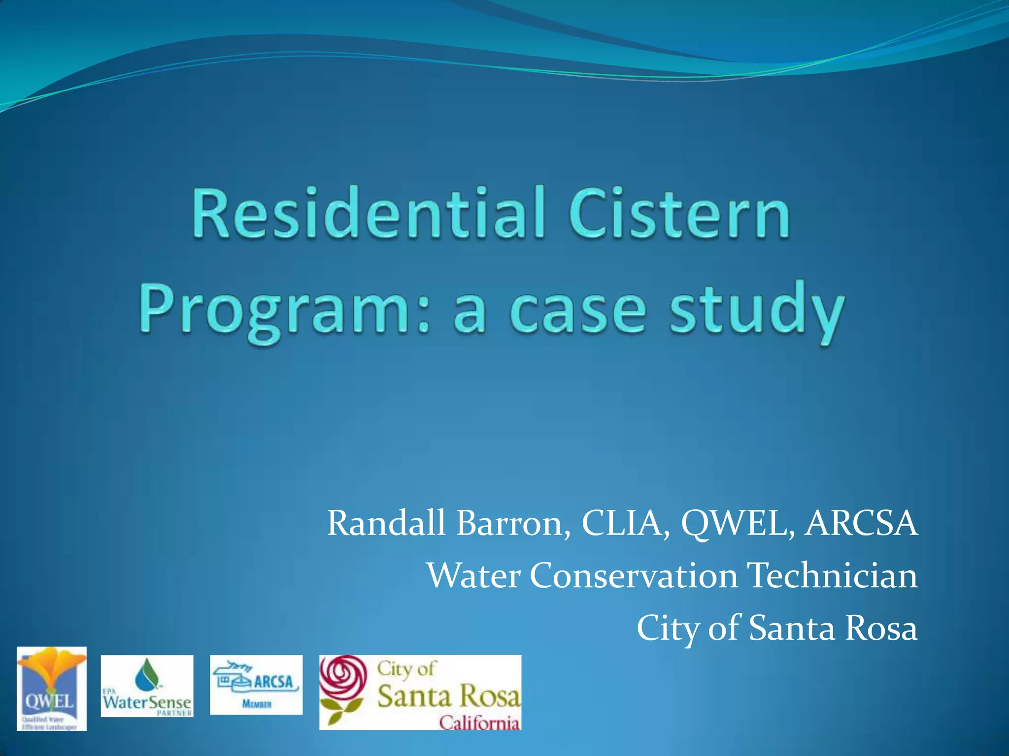 The document provides an overview of the water system and conservation programs for the City of Santa Rosa, California. It details that the city provides water and sewer services to over 52,000 connections and a population of 161,496 people. The water conservation program started in the 1970s and saves over 4,000 acre-feet of water per year. The program includes rebates for water efficient devices, irrigation audits, and a rainwater catchment rebate program. Two case studies are presented that show residential properties reducing their water usage by installing rainwater harvesting systems along with other water efficiency upgrades.