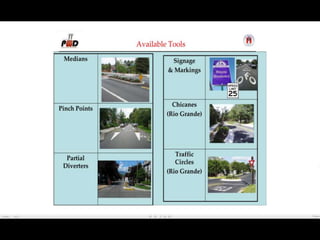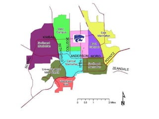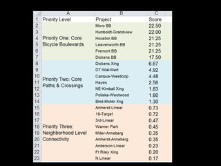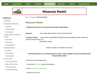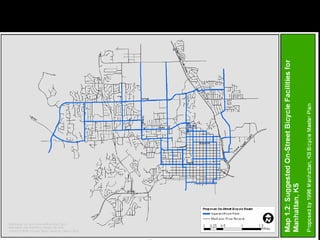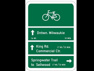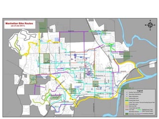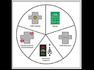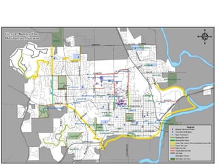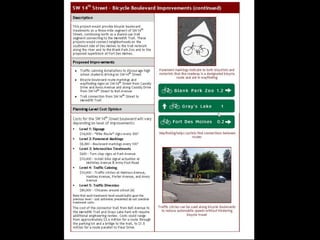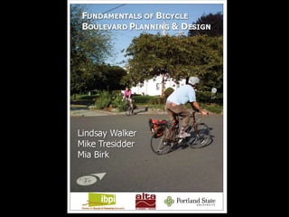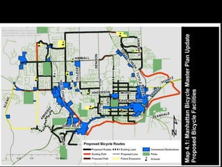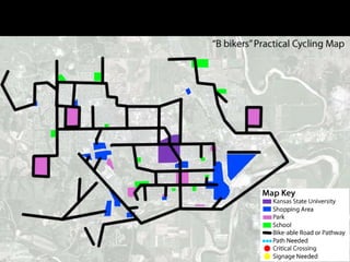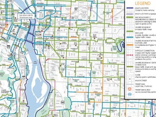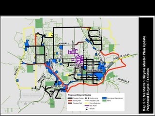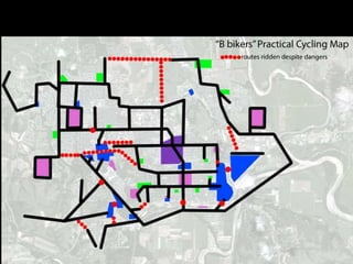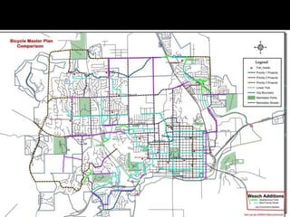 The document discusses bicycle infrastructure in various cities, focusing on Missoula's bicycle network and the need for improvements to accommodate different types of cyclists. It emphasizes the development of a comprehensive bicycle grid, prioritizing connections and safety for everyday riders, known as 'b-bikers'. Recommendations include marking current networks, upgrading informal routes to bicycle boulevards, and addressing existing gaps while promoting a livable street environment.