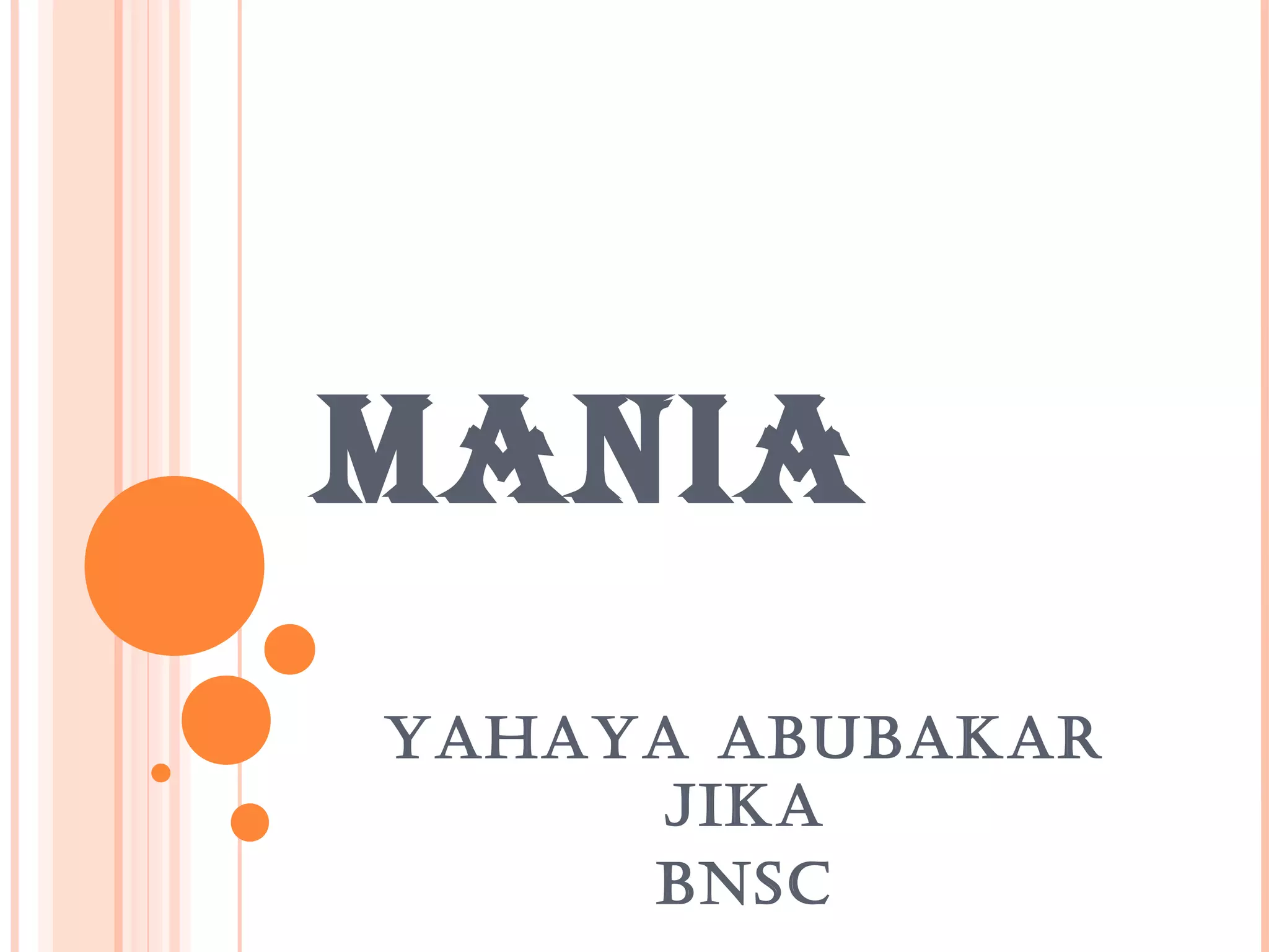 Mania is defined as a distinct period of abnormally and persistently elevated or irritable mood lasting at least one week. It can be classified as mixed states with both manic and depressive features, hypomania with less sleep needs and increased goal-motivated behavior, or associated with bipolar disorder. Causes may include genetic, biochemical, seasonal, or stressful life influences. Signs include inflated self-esteem, decreased sleep needs, pressured speech, distractibility, and risky behaviors. Treatment involves psychological therapies and organic treatments like mood stabilizers, antipsychotics, or benzodiazepines to control symptoms.