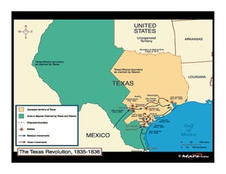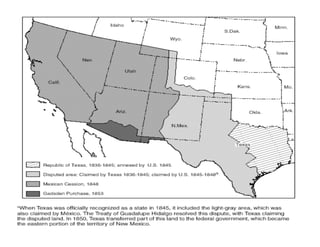 Manifest Destiny was the 19th century belief that America had a God-given destiny to expand its territory from coast to coast. Advocates argued the US had a responsibility to gain valuable natural resources and civilize the land. The document outlines the annexation of Texas from Mexico, including key events like the Battle of the Alamo and the Texas Revolution. It led to the Mexican-American War, where the US gained additional territory in the Southwest through the Treaty of Guadalupe Hidalgo. While expansionism was controversial due to slavery issues, the principle of Manifest Destiny ultimately prevailed in bringing Texas into the union as a state.