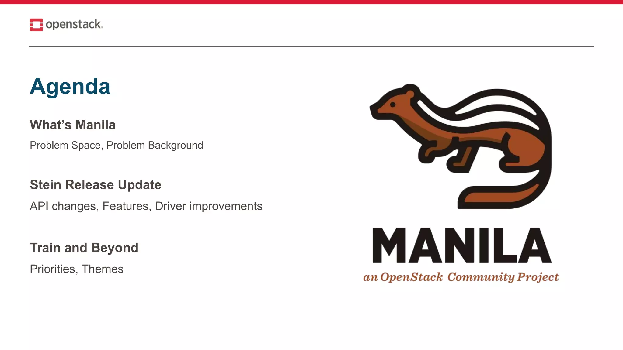 Manila is OpenStack's shared file system service that provisions and manages file shares across storage backends. The presentation provided an overview of Manila, including its architecture and problem space. It summarized the Stein release which added availability zone support, replication APIs, and driver improvements. It outlined the priorities for the upcoming Train release around scalability, resiliency, and interoperability. The presentation encouraged audience participation in Manila's development and provided resources for contributing.
