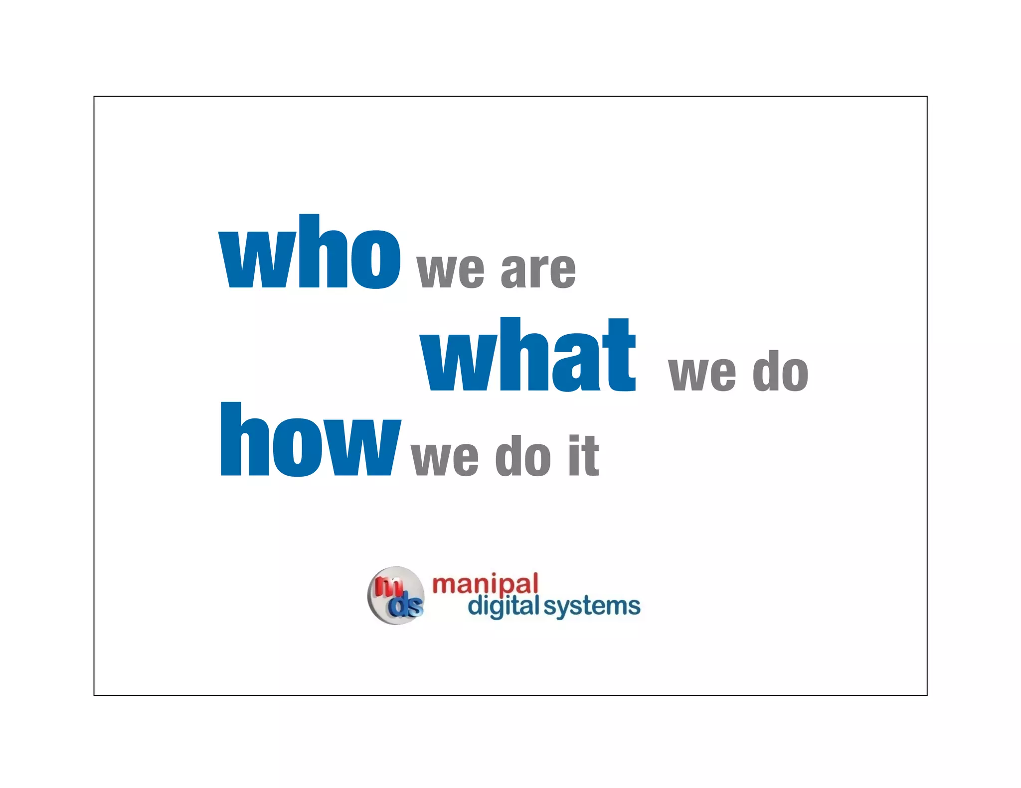 This document provides information about Manipal Digital Systems (MDS) and its parent company Manipal Press Limited (MPL). MDS is a subsidiary of the Manipal Group and provides pre-media production, creative content services, and technology solutions. MPL has over 65 years of printing experience and provides a variety of print services through multiple divisions using both digital and offset printing technologies. Together, MDS and MPL form an integrated content production and print services platform.