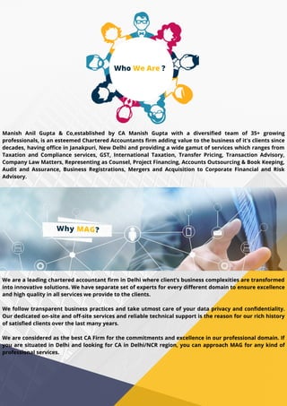 Manish Anil Gupta & Co is a chartered accountants firm based in Janakpuri, New Delhi, offering a diverse range of services including taxation, compliance, audit, and advisory solutions tailored to meet client needs. Founded by CA Manish Gupta, the firm prides itself on its highly qualified team, commitment to ethical practices, and customer satisfaction. Their mission is to deliver professional value while adapting to market changes and maintaining strong client relationships across various industries.