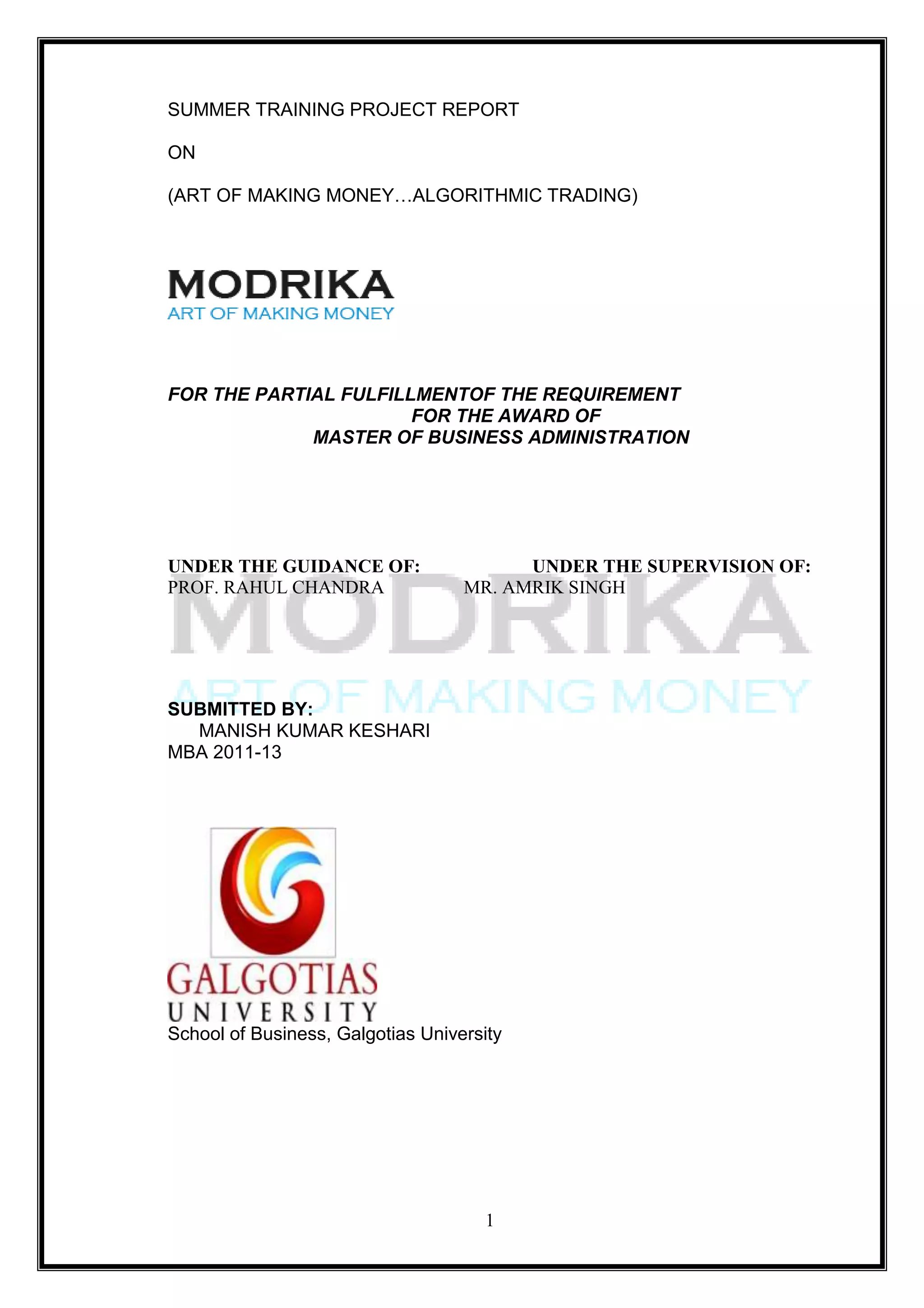 The document is a summer training project report submitted by Manish Kumar Keshari for his MBA program. It discusses algorithmic trading, which involves using computer algorithms to automate trading decisions and transactions. The report provides an introduction to algorithmic trading, outlines some of its advantages like speed and reliability over human traders, and discusses challenges like developing robust strategies and systems. It also describes some key components needed for an automated algorithmic trading system.