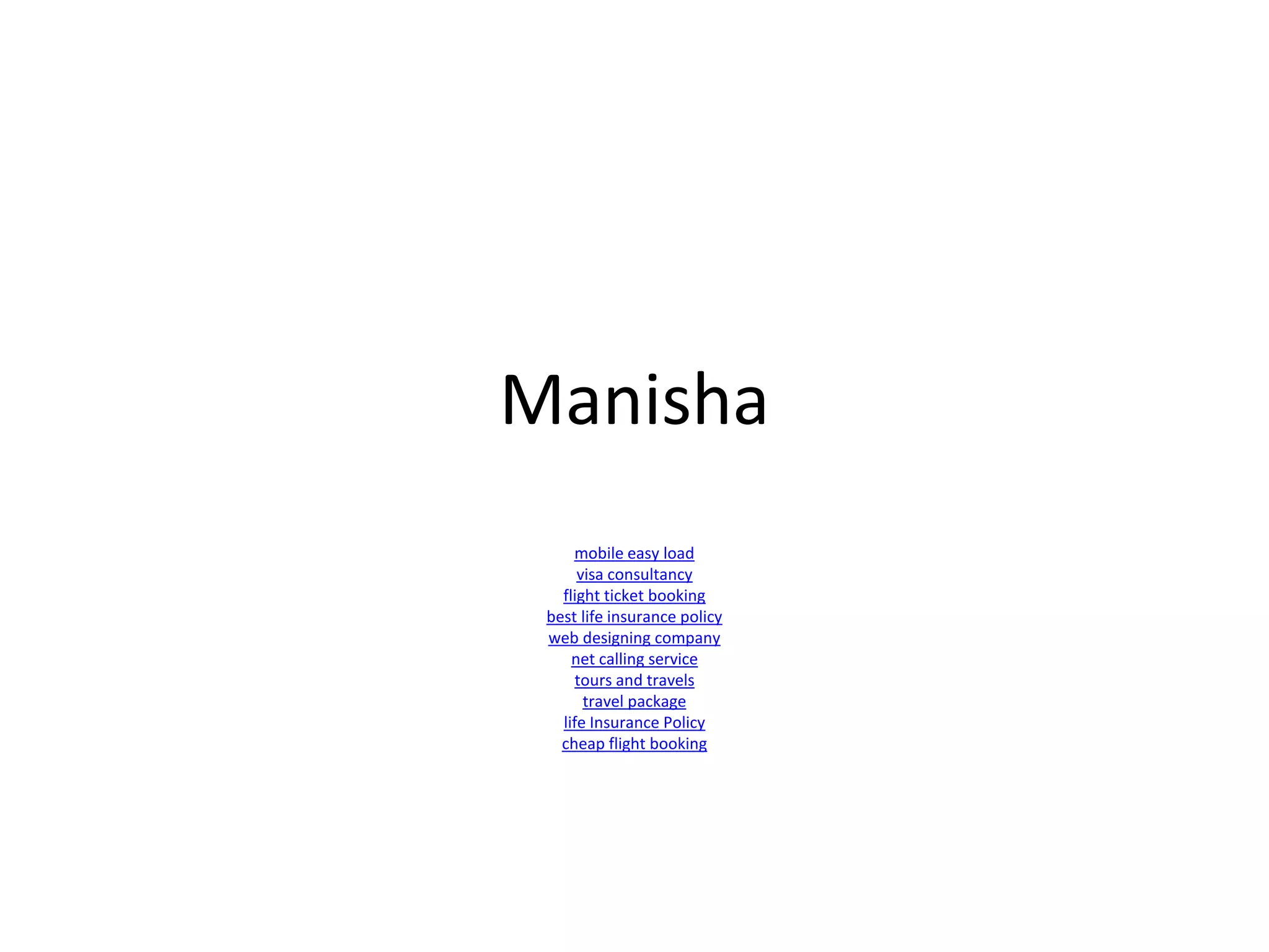 This document lists various services including mobile recharge, visa consultancy, flight ticket booking, life insurance policies, web design, internet calling, tours and travel packages, and cheap flight booking. It appears to advertise an individual or company called Manisha that offers these consumer and business services.