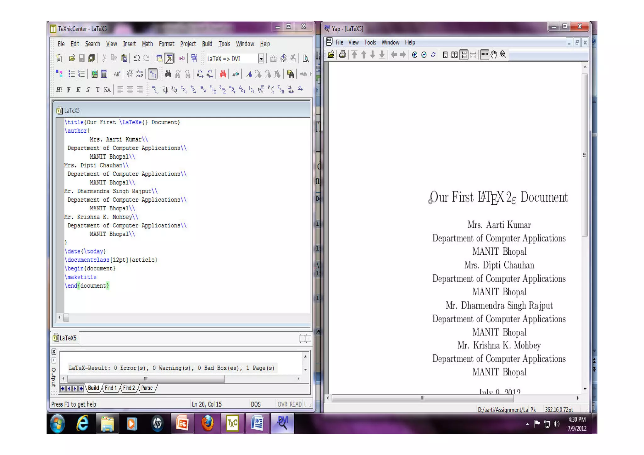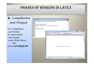 The document discusses the phases of working in LaTeX including compilation and output, the structure of a LaTeX document, defining the title and author, adding sections and subsections, and text formatting. It provides information on the output files like .dvi, .ps, and .pdf generated during compilation. It also demonstrates how to define the title, author, date and include a maketitle command to display it. Sections and subsections can be added using commands like \section and \subsection along with headings. Finally, it lists some common text formatting commands in LaTeX.
