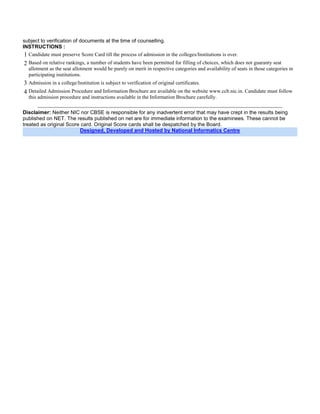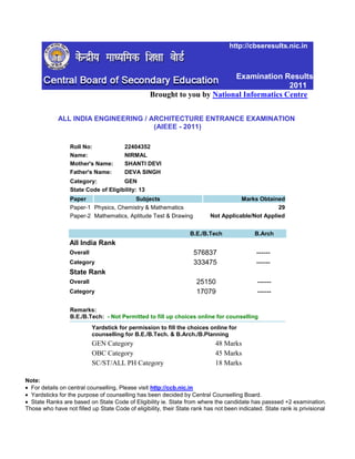 Nirmal received a score of 29 on Paper 1 of the AIEEE 2011 exam, which tested physics, chemistry, and mathematics. Based on this score, Nirmal's all India rank was 576837 for B.E./B.Tech programs and 333475 for the general category. Within his state, his overall rank was 25150 and 17079 for the general category. However, Nirmal was not permitted to fill out online choices for counseling due to his score being below the 48 mark yardstick set for the general category.