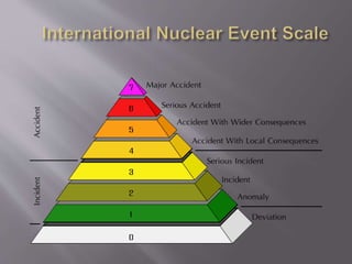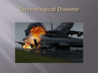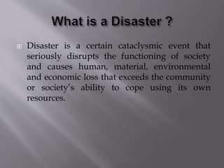 The document defines different types of disasters including natural disasters like floods and earthquakes, man-made disasters triggered by human activity, and technological disasters caused by industrial accidents or infrastructure failures. It provides examples of specific disaster types such as nuclear disasters from accidents at Chernobyl and Three Mile Island, the Bhopal chemical plant leak, and oil spills. The impacts of disasters can persist for years through conditions like PTSD, depression, and anxiety.