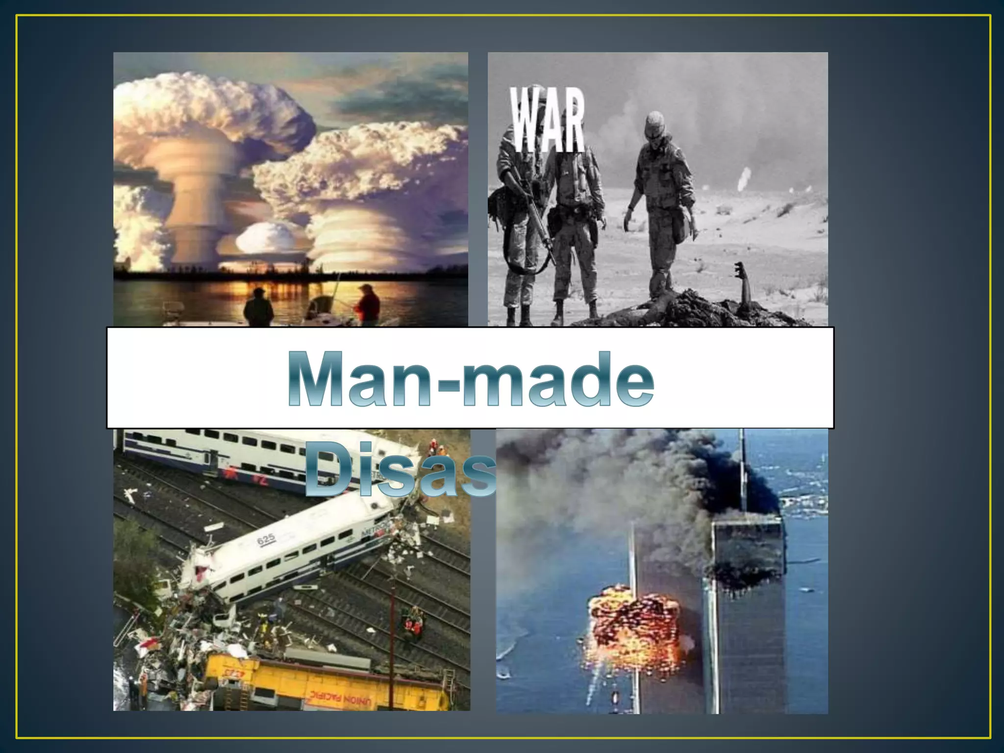 Man-made disasters are caused by technological or human-induced hazards such as fires, transport accidents, industrial incidents, terrorism, and nuclear explosions. Examples of specific man-made disasters include nuclear disasters, biological disasters, chemical disasters, fires, road accidents, terrorism, and epidemics. Nuclear disasters involve nuclear reactions that power atomic and hydrogen bombs. Chemical disasters result from the irresponsible handling and misuse of powerful chemicals in industries. Terrorism aims to terrorize people using violence and weapons without warning.
