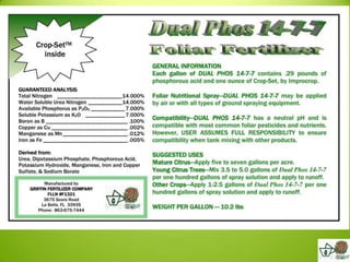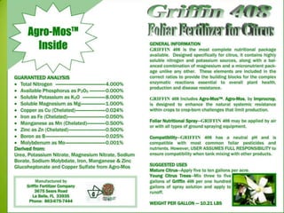 Timmy Mann from Ben Hill Griffin, Inc. presented on foliar fertilizers. He discussed that foliar fertilizers provide a practical approach to plant nutrition and increase disease resistance and production. Proper foliar fertilizers are soluble and compatible with other products. Nutrient deficiencies can weaken plant defenses and increase susceptibility to disease, while maintaining optimal nutrient levels through foliar applications supports both plant health and higher yields. Studies show that foliar applications of nutrients like potassium nitrate and monoammonium phosphate can increase orange production and quality.