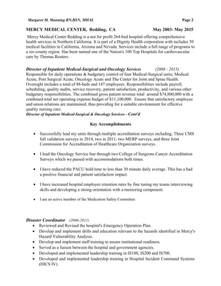 This document is a resume for Margaret M. Manning, who has over 25 years of nursing experience including extensive experience as a Director of Nursing. Her resume summarizes her professional experience including roles as Chief Nursing Officer, Nursing Shift Supervisor, and Director of Inpatient Medical-Surgical and Oncology Services. She has skills in nursing management, change management, disaster management, and quality improvement initiatives.