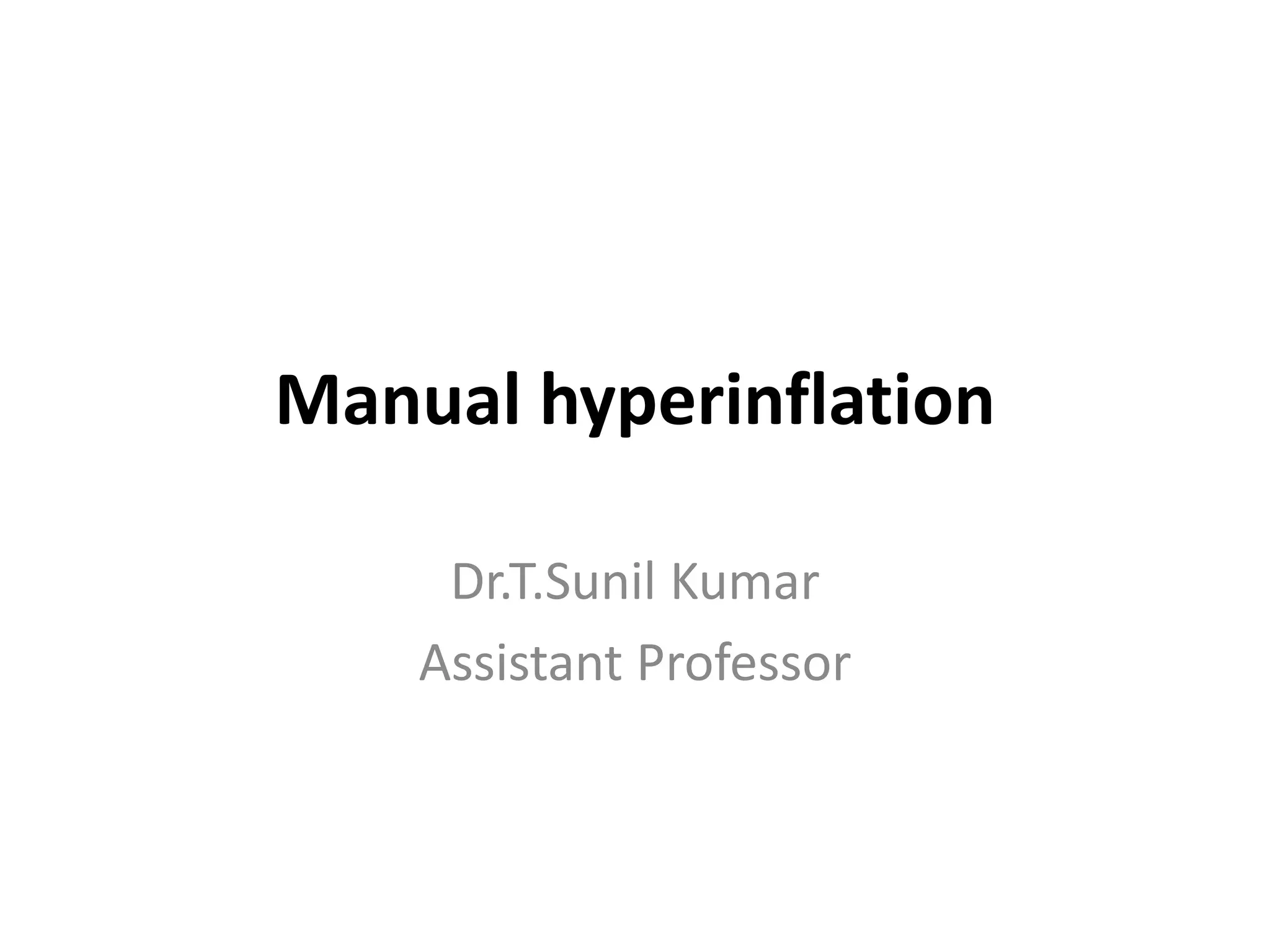 This document details the technique of manual hyperinflation, highlighting its use in hand-ventilating patients during physiotherapy and the tools involved such as water's bags and ambu-bags. It emphasizes the therapeutic effects, indications, and potential hazards like reduced blood pressure and oxygen saturation issues. Important considerations and contraindications for physiotherapy during manual hyperinflation are also discussed to ensure patient safety and effectiveness of treatment.