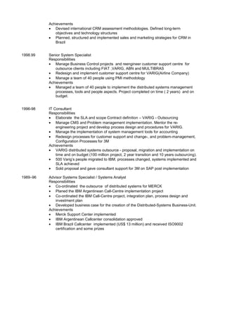 This document provides a summary of Luciene Gomes Manoel's education and work experience. She has a Masters in Business Administration from Imperial College London and degrees in Information Technology from universities in Brazil. Her career has included roles as a CRM consultant and project manager at IBM Brazil, managing CRM projects for Unisys Brazil, and consulting work for companies in Portugal and the UK. She has skills in CRM systems, project management, process design, and languages.