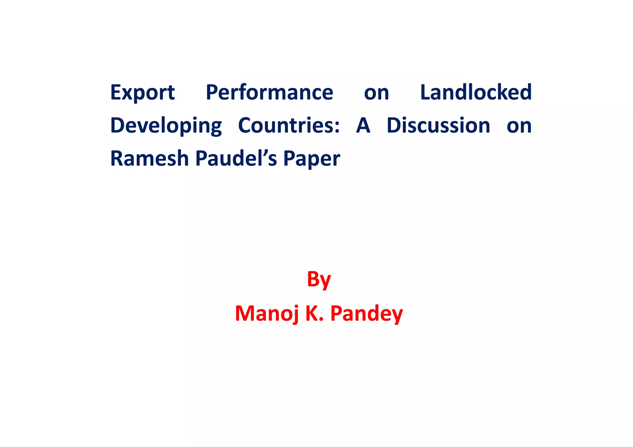 This document discusses Ramesh Paudel's paper on export performance in landlocked developing countries. It summarizes the paper's objective to examine export determinants in landlocked countries and compare their performance to other developing countries. The analysis uses an augmented gravity model specification with cross-country data from 1995-2010, estimating models with different econometric methods. Key results found landlocked developing countries had poorer export performance than other developing countries, distance deterred exports, and African landlocked countries performed similarly to other landlocked countries. However, the discussant raises some issues with the model specification and inconsistencies in the econometric results. In conclusion, while the paper contributes to understanding landlocked country exports, some determinants appeared obvious and results