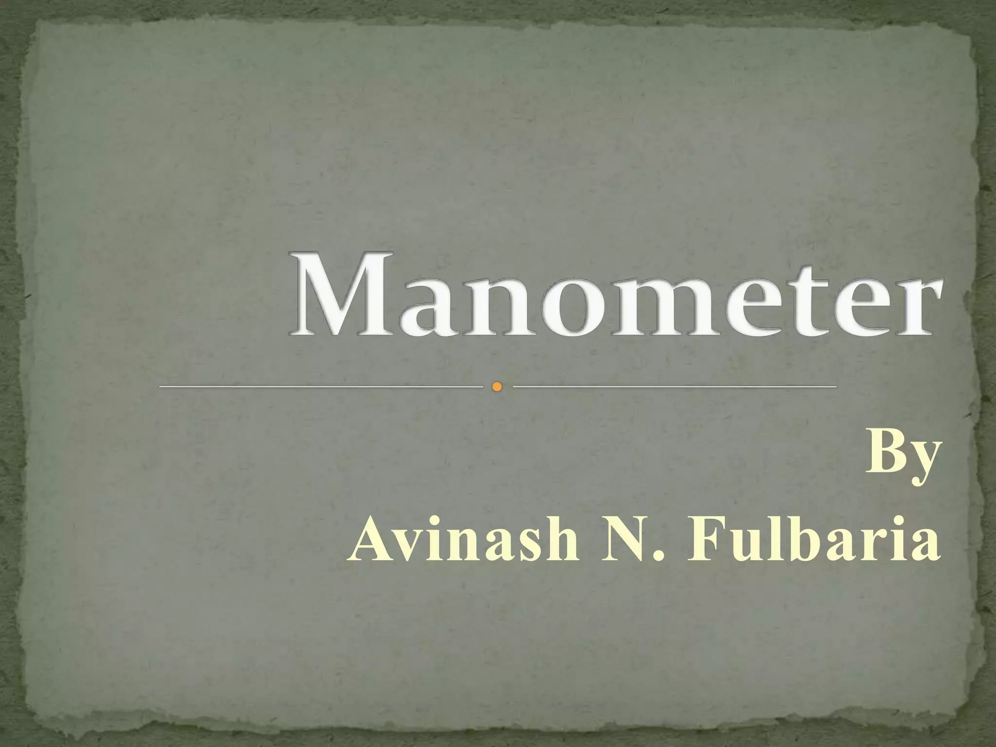A manometer is an instrument that uses a column of liquid to measure pressure. There are several types of manometers including U-tube manometers, well type manometers, barometers, inclined tube manometers, and micromanometers. Each type uses the hydrostatic balance principle where pressure is measured by the height of the liquid column supported. For example, a well type manometer has one leg as a simple tube and the other as a large well, allowing small displacements in the well to create large changes in height of the simple tube.