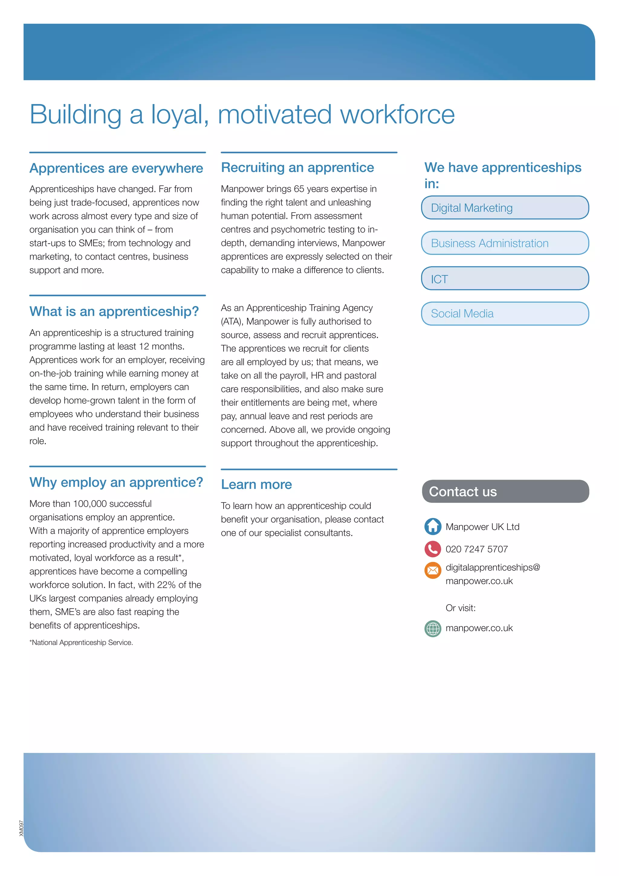 An apprenticeship is a structured training program lasting at least 12 months where apprentices work for an employer, receiving on-the-job training while earning money. Employers benefit from developing homegrown talent with training relevant to their role. More than 100,000 successful organizations employ apprentices to increase productivity and develop a more motivated, loyal workforce. Manpower recruits apprentices through assessments and interviews to source candidates that can make a difference for their clients.