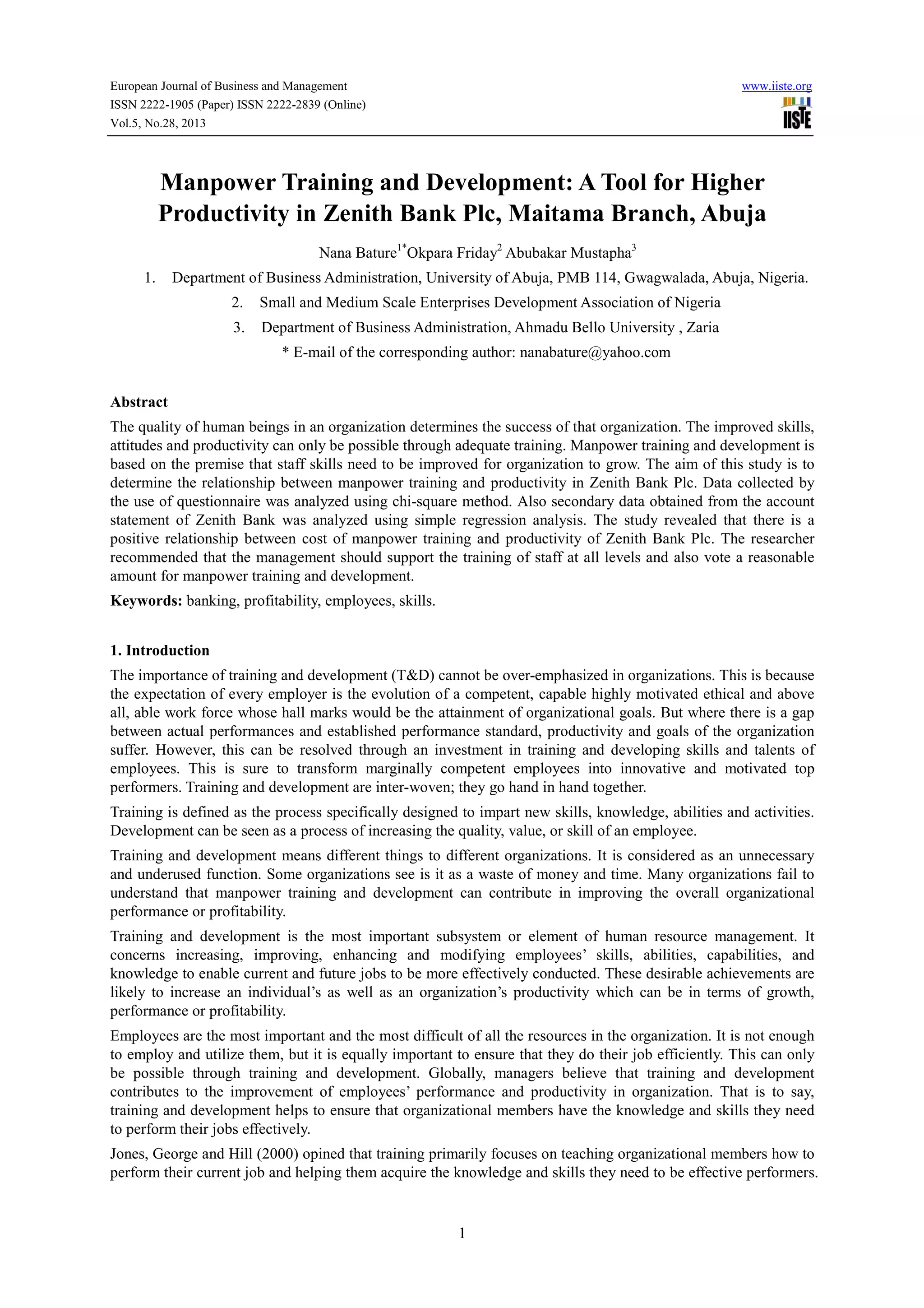 Manpower training and development is positively related to productivity at Zenith Bank Plc. The study examined the relationship between manpower training costs and profitability at Zenith Bank Plc's Maitama branch in Abuja, Nigeria from 2001-2010. Data was collected through questionnaires and the bank's financial statements, and analyzed using chi-square tests and regression analysis. The results showed a significant positive relationship between the cost of manpower training and the bank's productivity and profitability. The study concluded that manpower training improves employee skills and performance, leading to higher productivity and profits for the bank.