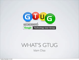 The document discusses GTUG (Google Technical User Group) chapters around the world and in Egypt. It provides statistics on the number of chapters, countries with chapters, and events in the past six months. It also discusses GTUG activities in Cairo and Mansoura, Egypt, including sessions on technology topics and conference-style events. Upcoming plans are mentioned, including a two-day meetup in Mansoura in December 2011 aimed at students, entrepreneurs, businesses and NGOs, and developers.