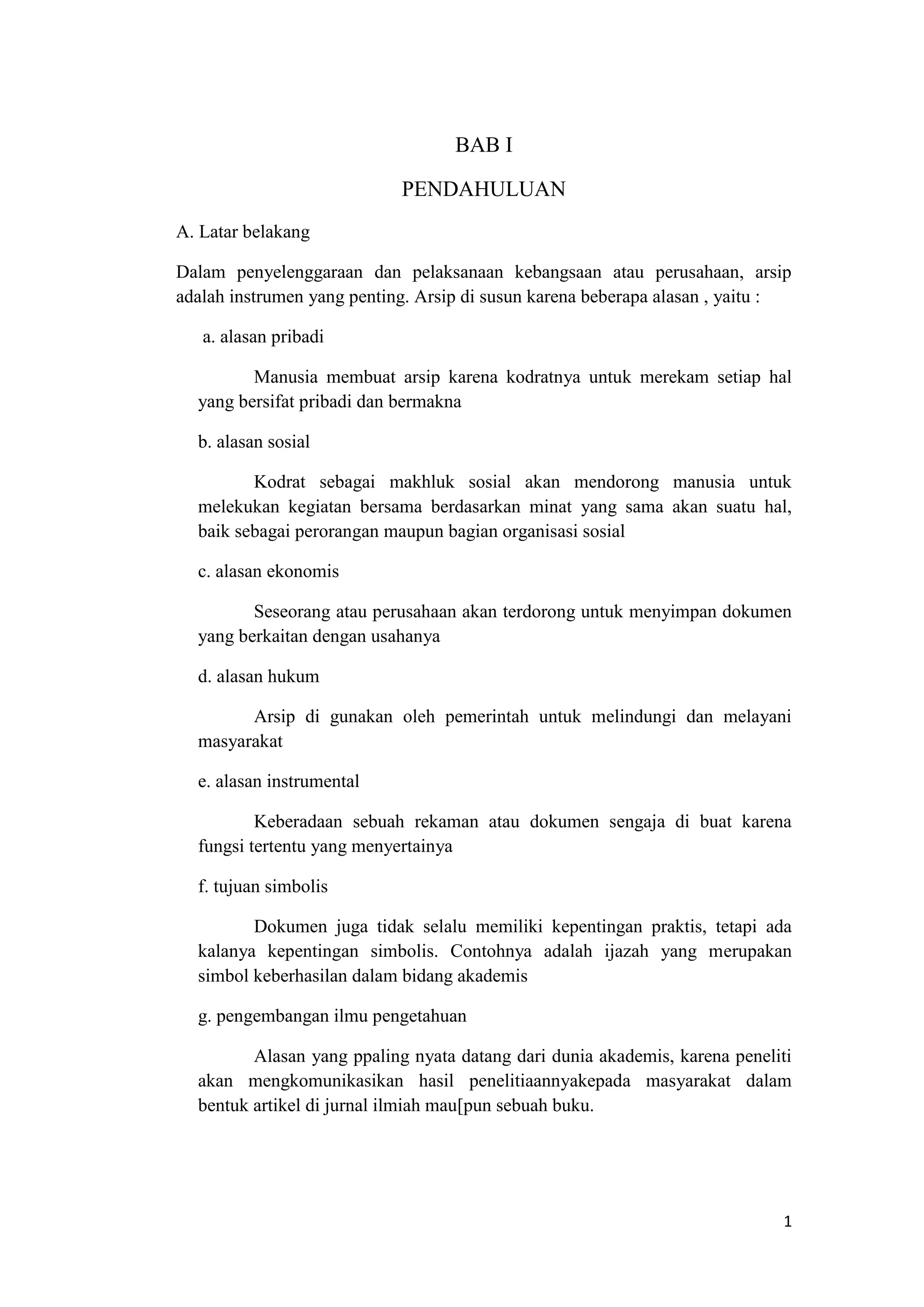 Dokumen ini menjelaskan pentingnya arsip dalam penyelenggaraan kebangsaan dan perusahaan, serta peranan, jenis, dan fungsi arsip yang diatur dalam manajemen kearsipan. Arsip memiliki banyak manfaat, termasuk sebagai sumber informasi dan alat pengawasan, namun seringkali dinilai kurang penting. Dalam pengelolaannya, dipaparkan dua model manajemen arsip yaitu model siklus hidup dan model arsip berkelanjutan.