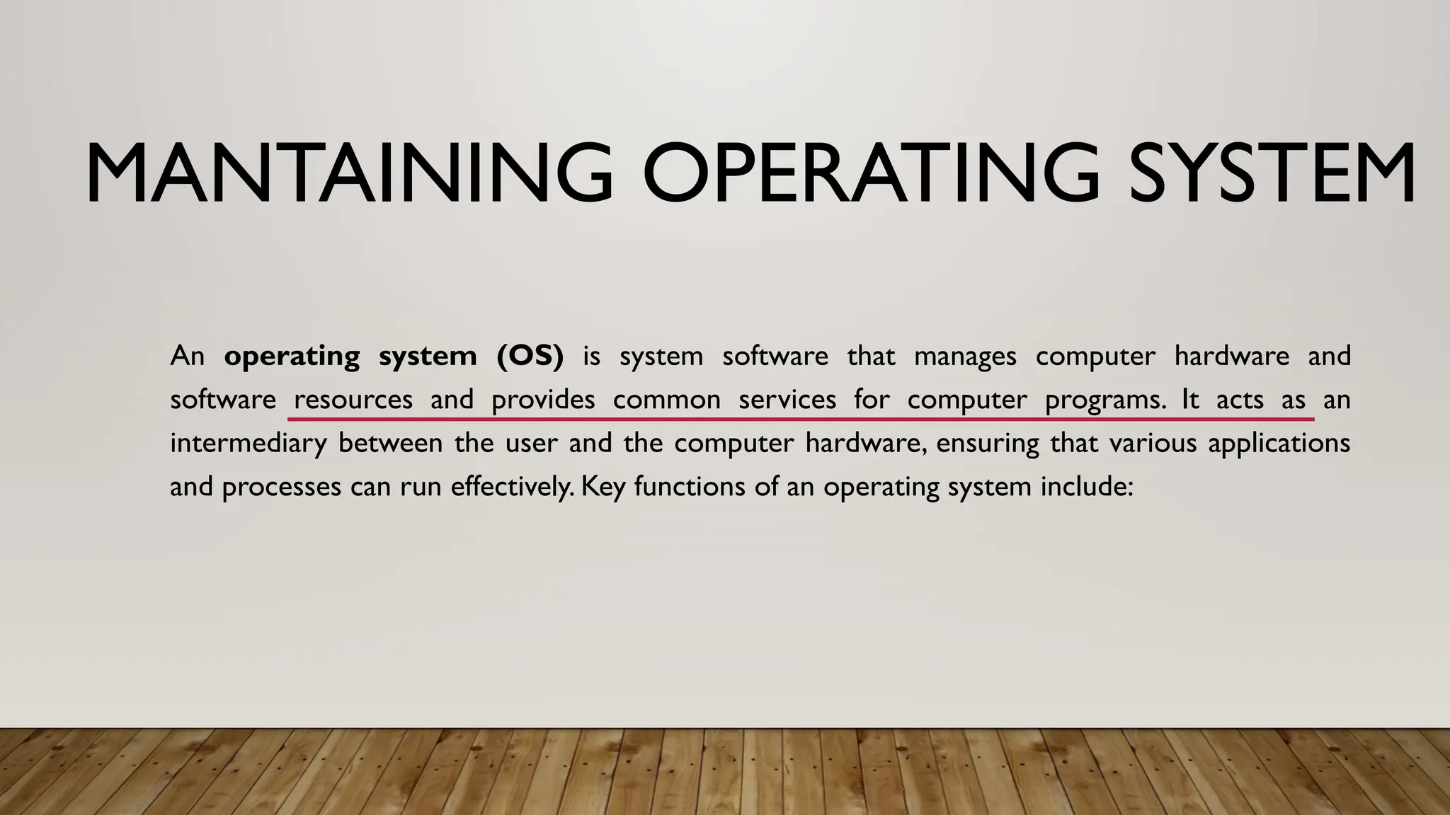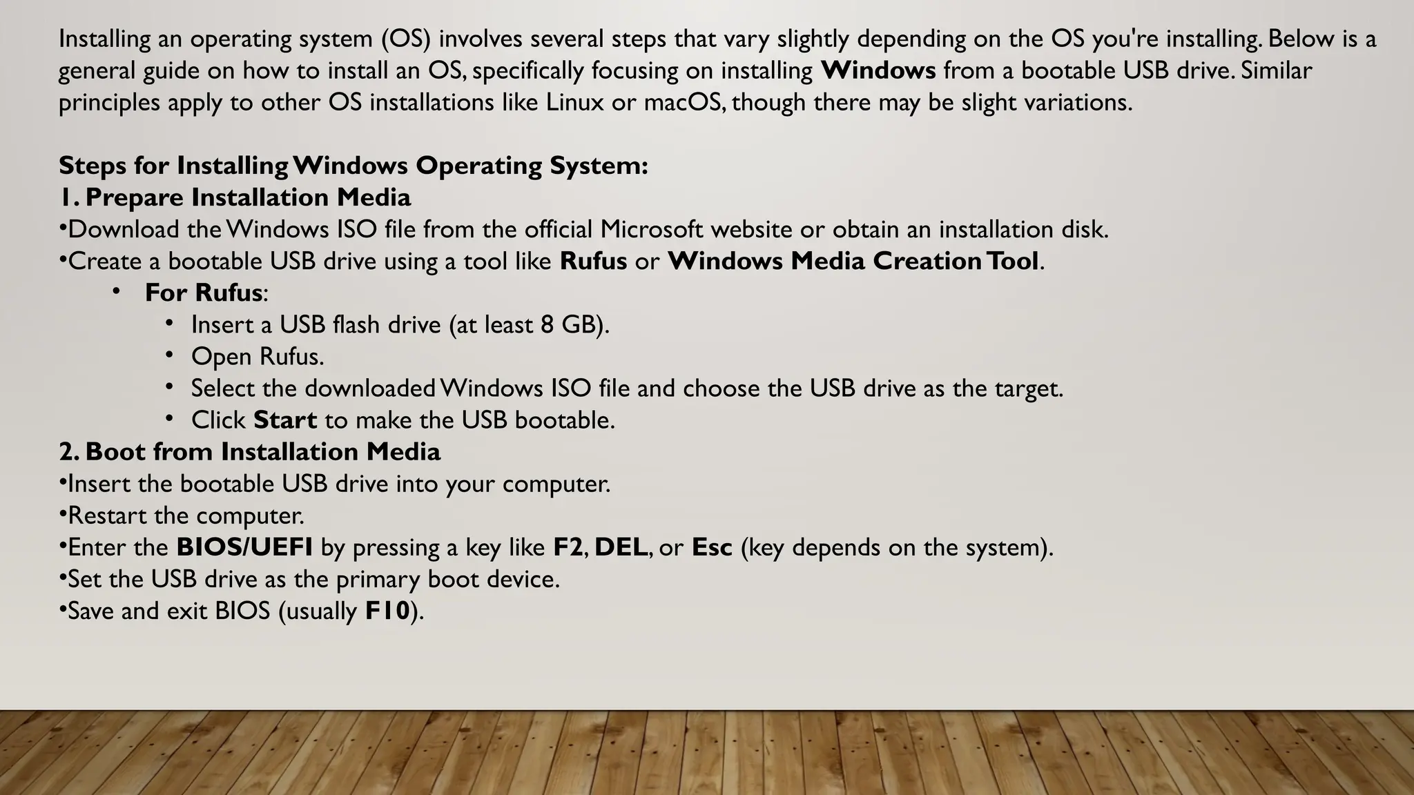 The document discusses the definition and functions of an operating system (OS), detailing the steps to install Windows from a bootable USB drive and how to manage drivers afterward. It highlights various aspects of OS management, including resource and process management, memory allocation, and security controls, while also providing basic DOS commands for file and directory management. Overall, it serves as a guide for setting up and maintaining a computer's operating system effectively.