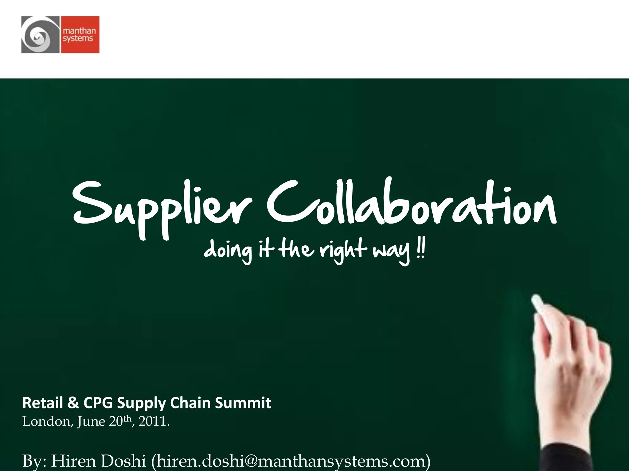 The document discusses the evolution of supplier collaboration and the benefits of an integrated supplier portal. It outlines how supplier collaboration has progressed from basic document exchange to more advanced processes like CPFR that integrate planning and forecasting between retailers and suppliers. It notes the deficiencies of traditional departmentalized approaches with multiple supplier systems. The document then proposes that a single, integrated supplier collaboration platform can automate processes, enable two-way communication, provide analytics, and scale collaboration beyond just top suppliers. It introduces the Manthan SPA supplier portal and analytics solution as an example of a product available today that can optimize processes and enhance performance between retailers and suppliers.