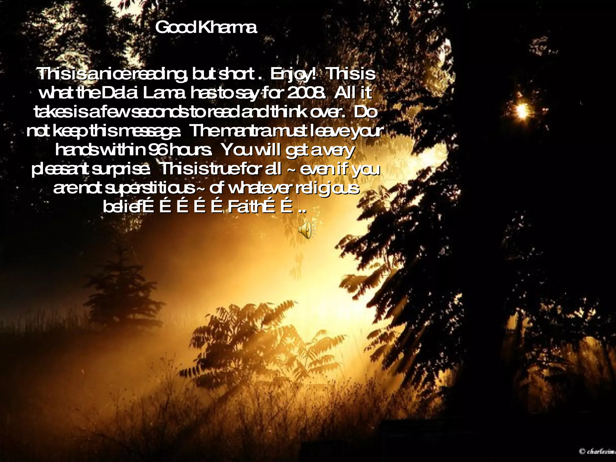 This short reading contains advice from the Dalai Lama for living a meaningful life in 2008. It provides over 20 brief sayings on topics like relationships, mistakes, values, sharing knowledge, and living fully. The document ends by encouraging the reader to forward the message within 96 hours for improvements in their life.