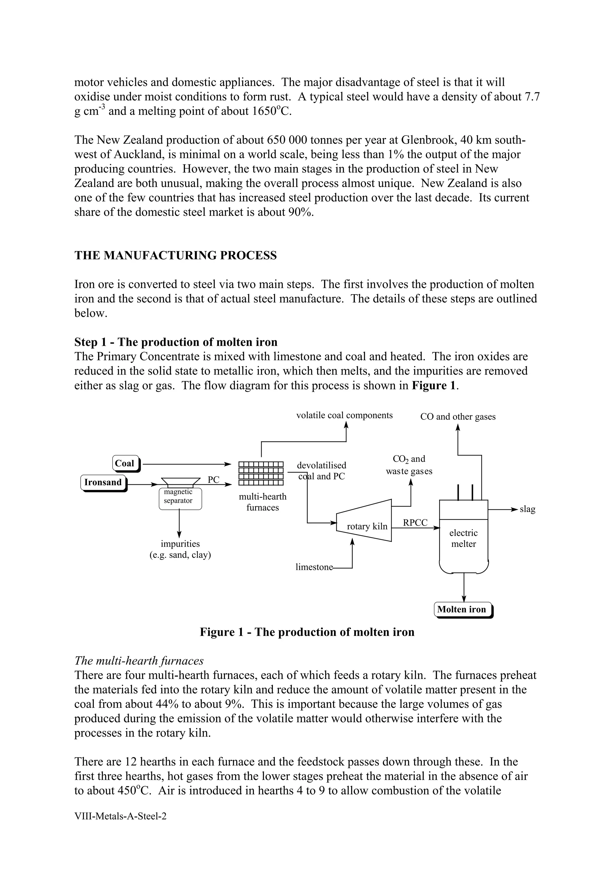 This document summarizes the process of steel manufacturing in New Zealand. Iron ore is first reduced to iron in rotary kilns, producing a substance called reduced primary concentrate and char. This is then melted into molten iron in electric melters. The molten iron undergoes vanadium recovery and is then converted to steel in a Klockner Oxygen Blown Maxhutte furnace. Oxygen is blown through the furnace to oxidize impurities, which are separated as slag. Alloying elements are then added to produce the final steel product.