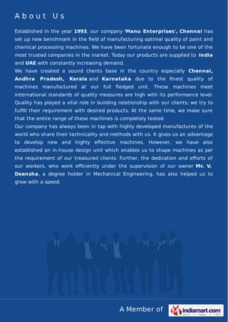 Manu Enterprises is a manufacturer and exporter of grinding machines, grinding mills, emulsifiers, and mixers located in Chennai, India. It was established in 1993 and supplies products to printing, ink, and allied industries. The company has a large product portfolio that includes basket mill machines, bead mill machines, ball mill machines, high shear emulsifiers, high speed dispersers, industrial mixers, and more. It prides itself on its experienced research and development department and large production capacity.