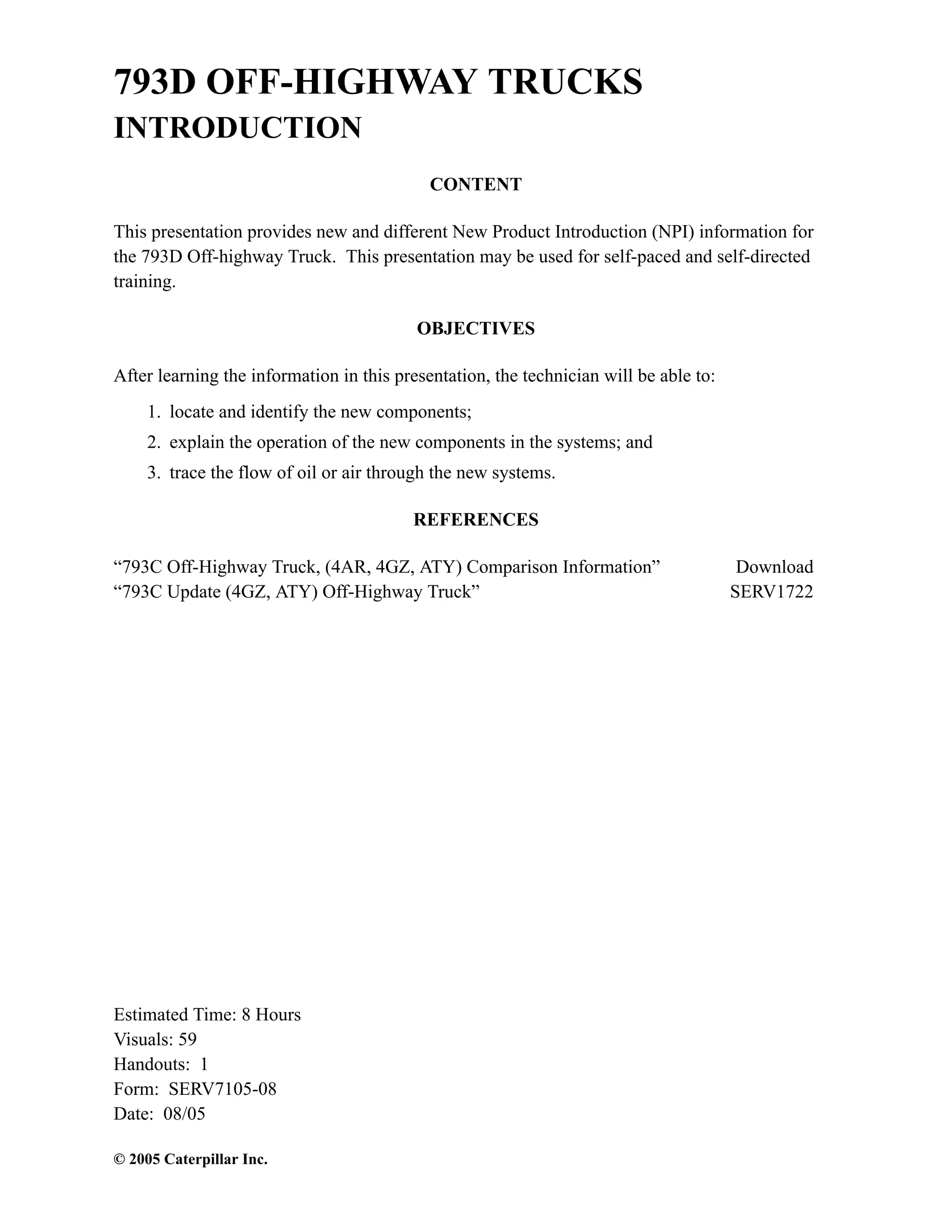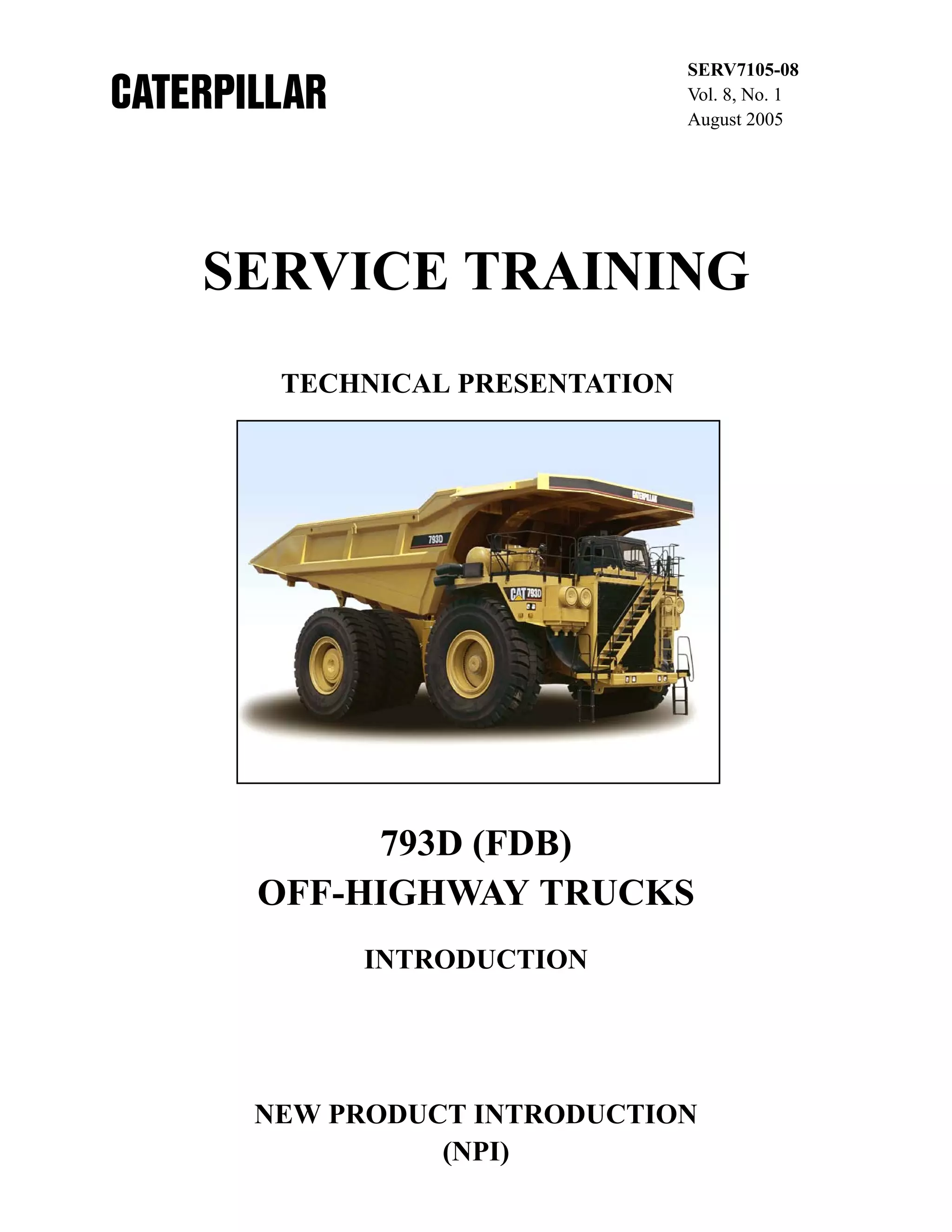 The document provides an overview of the key changes and new features for the 793D off-highway truck, including: increased speed and horsepower, extra retarding capability, continuous rear axle filtration, and an improved cooling package. It describes the new hydraulically-driven engine cooling fan system and changes to systems like the rear axle lubrication, steering, and brake cooling. The summary focuses on the high-level system changes between the 793C and 793D trucks.