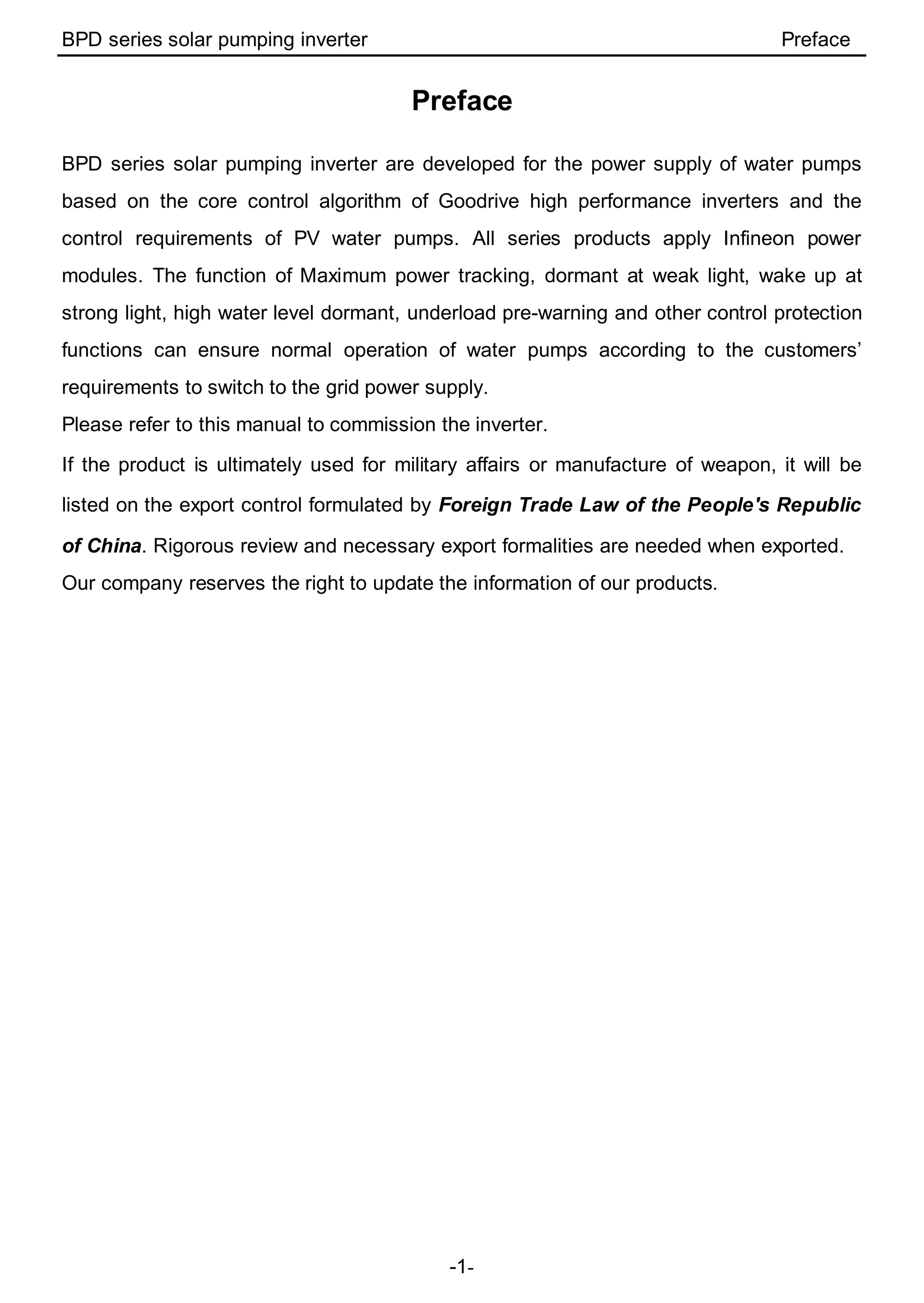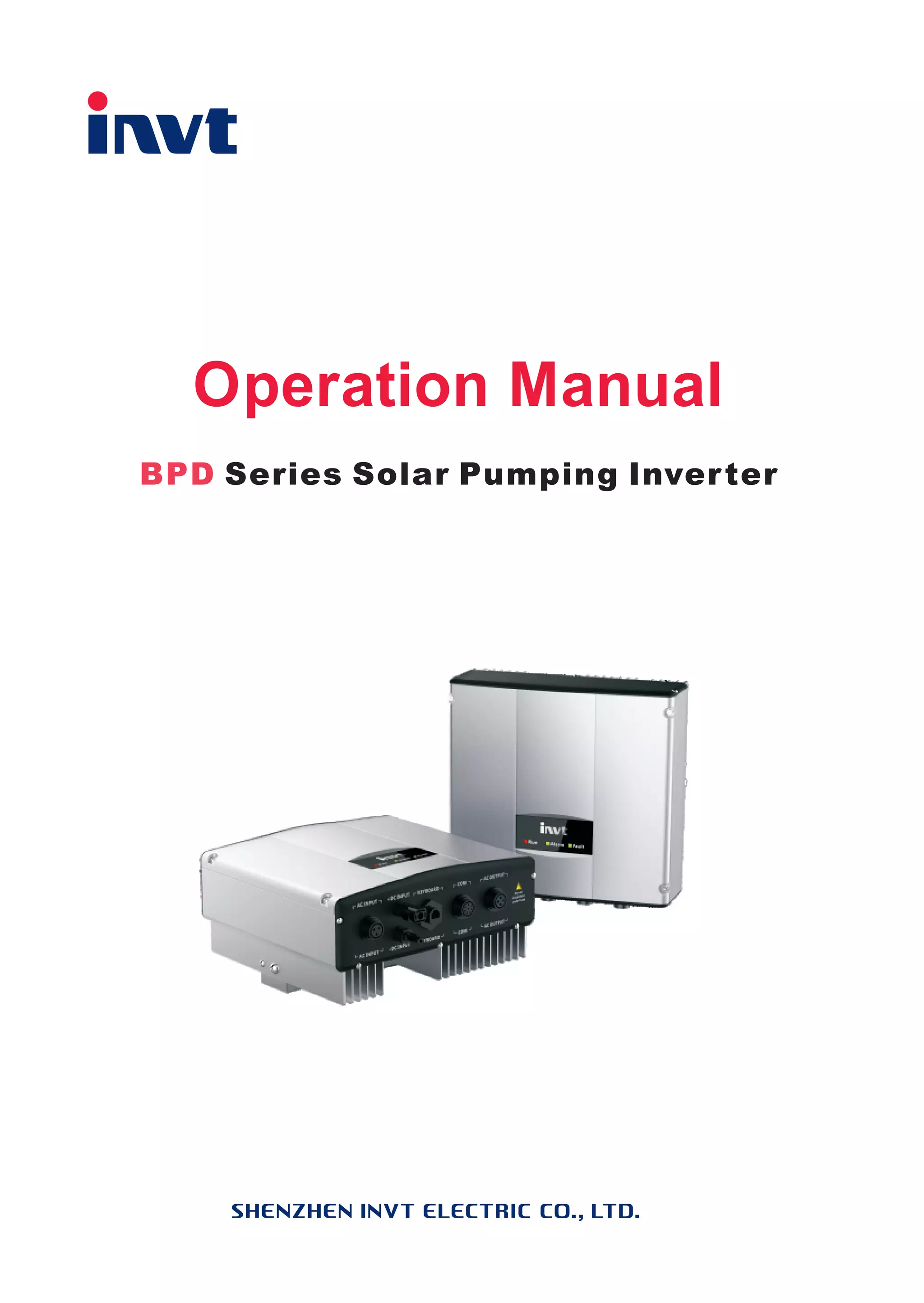 The BPD series solar pumping inverters are designed for powering water pumps using advanced control algorithms and Infineon power modules, featuring functions like maximum power tracking and various protective controls for safe operation. The document outlines crucial safety precautions, installation guidelines, product specifications, and commissioning procedures to ensure proper setup and maintenance. Additionally, it includes detailed instructions for keypad operation and troubleshooting to optimize inverter performance.