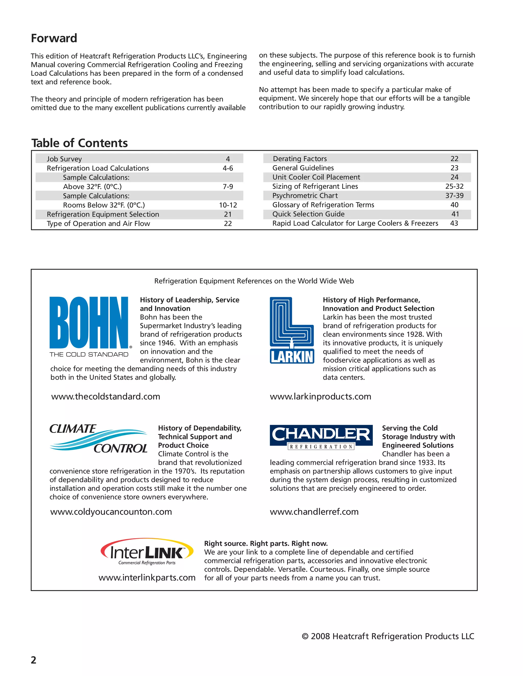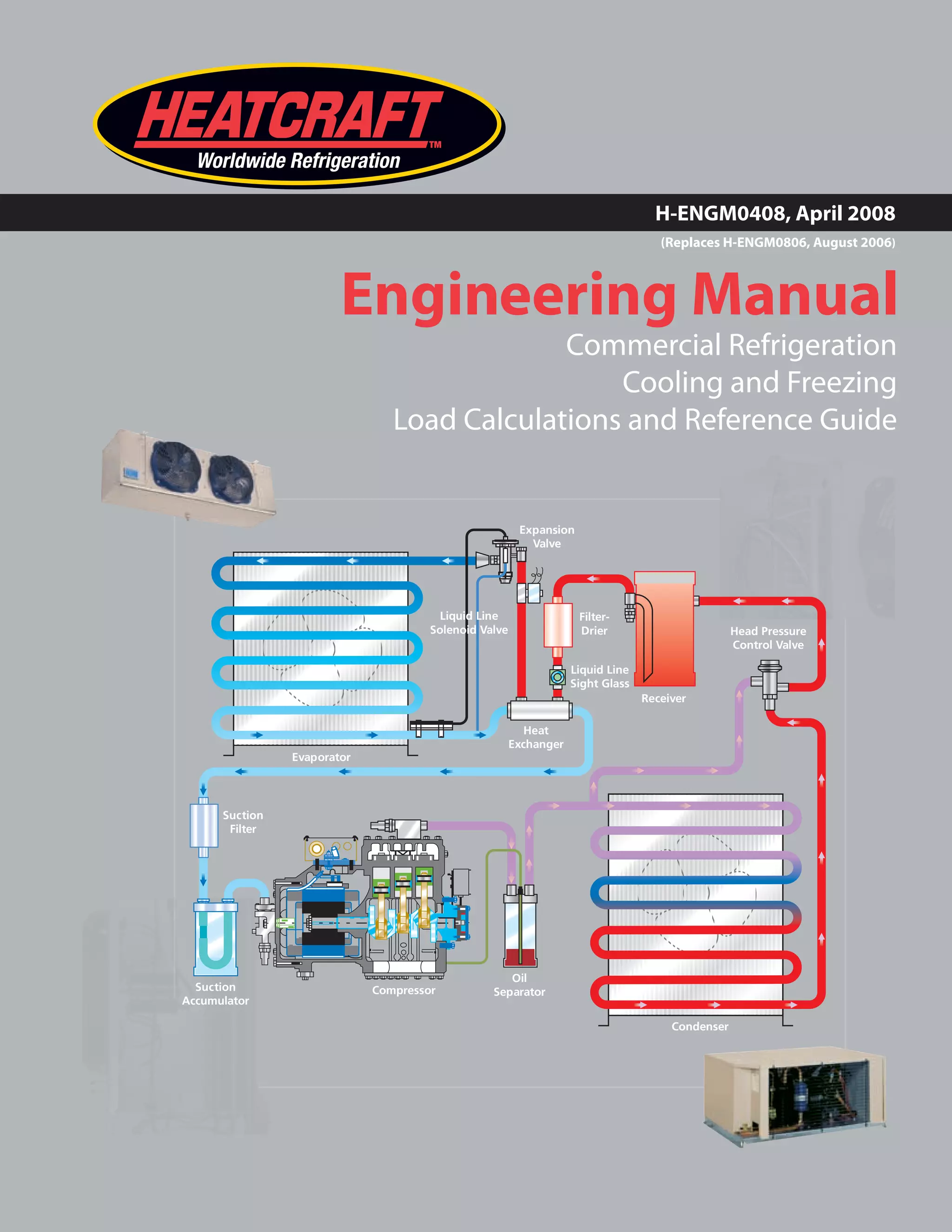 This document provides guidance on calculating refrigeration loads for commercial refrigeration systems. It outlines the key factors to consider in an initial job survey, including design temperatures, storage requirements, dimensions, insulation, infiltration, and product details. It then describes the main sources of heat gain to calculate: transmission load through walls/floors, air changes, miscellaneous loads, and product load. Tables and examples are provided to simplify calculating each load. Quick selection charts and calculators are also included to estimate loads for small/medium and large coolers and freezers when full calculations are not possible.