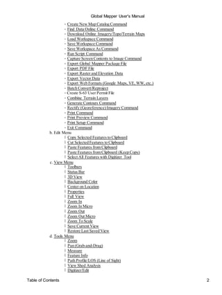 The document is the user manual for Global Mapper software. It provides instructions on downloading and installing the software, registering for full access to features, and an overview of the program menus and tools. The File menu allows opening and importing data, loading workspaces, exporting data to various formats, and saving screenshots. The View and Tools menus control map display and analysis tools. Registration is required for advanced mapping, analysis, and exporting functions.