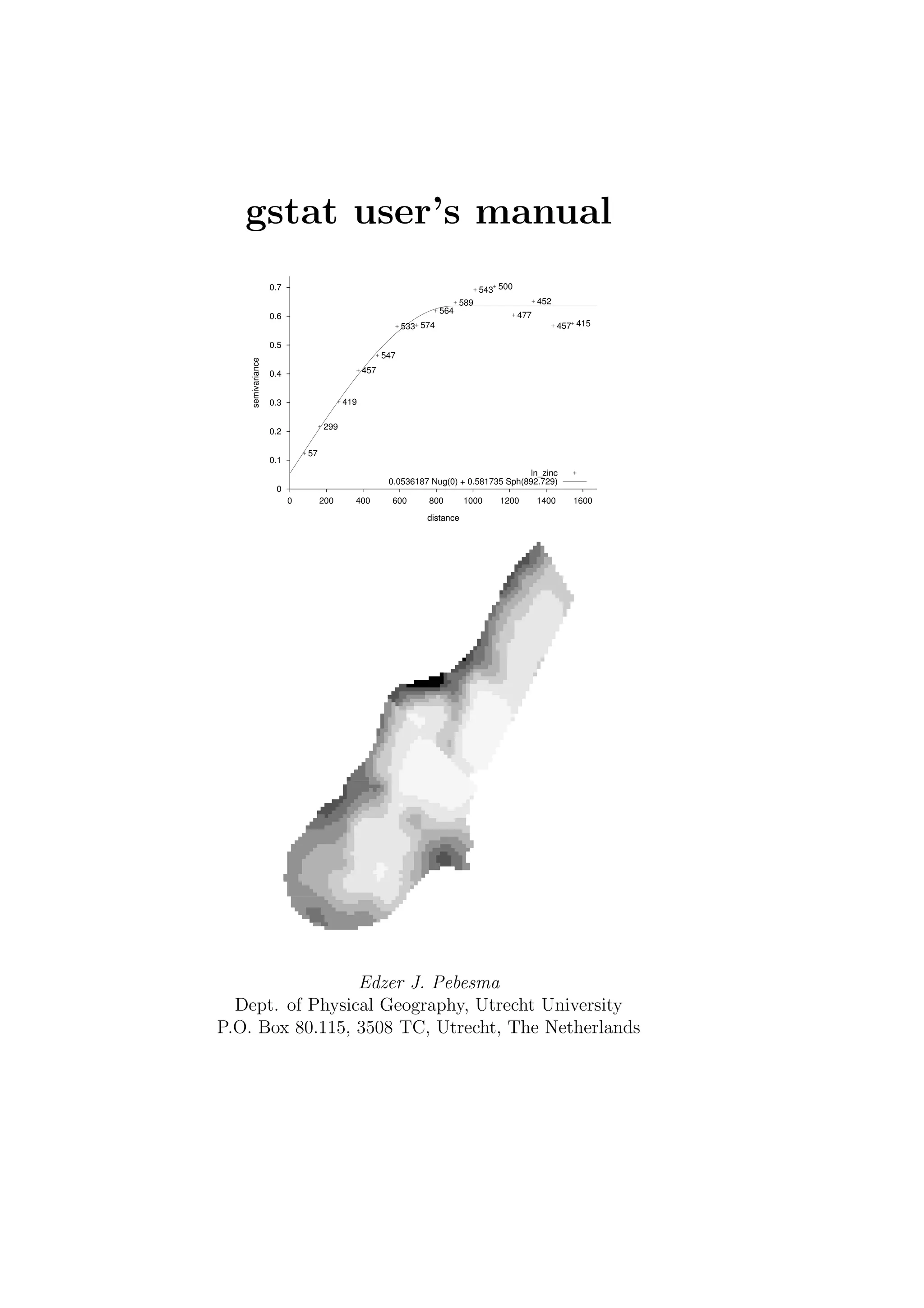 This document provides a user manual for gstat, a program for geostatistical modeling, prediction, and simulation of spatial data in one, two or three dimensions. Gstat allows for variogram modeling, kriging (prediction), and simulation using a variety of methods. It supports many data formats and provides a flexible command language for controlling geostatistical analyses. The manual describes the capabilities and proper use of the gstat program.