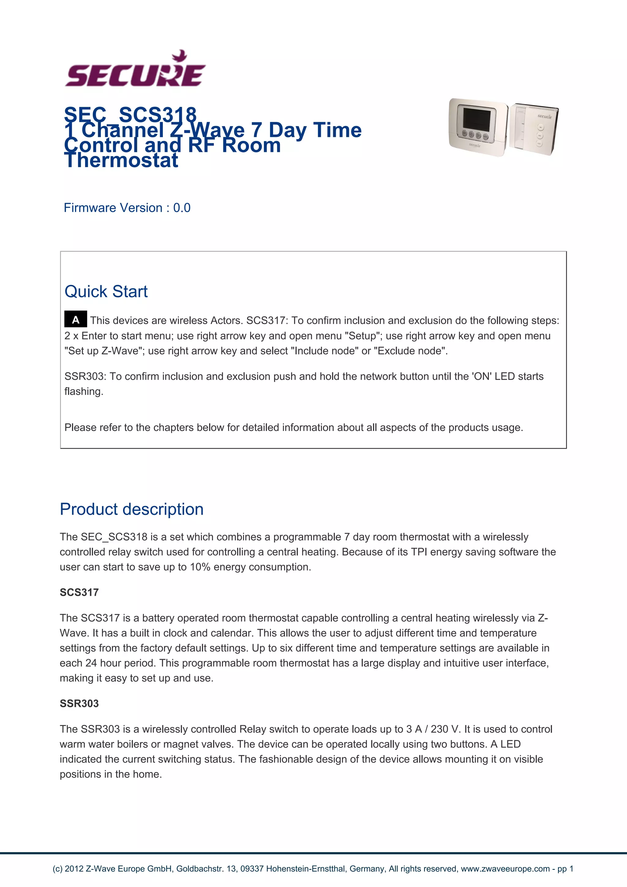 This document provides instructions and specifications for a set combining a programmable 7-day room thermostat and a wirelessly controlled relay switch for central heating control. The thermostat can be programmed with up to six temperature settings per day. The relay switch is used to control heating loads up to 3A/230V and can be operated locally or controlled by the thermostat wirelessly. Instructions are provided for installation, inclusion in a Z-Wave network, configuration, and operation of both devices.