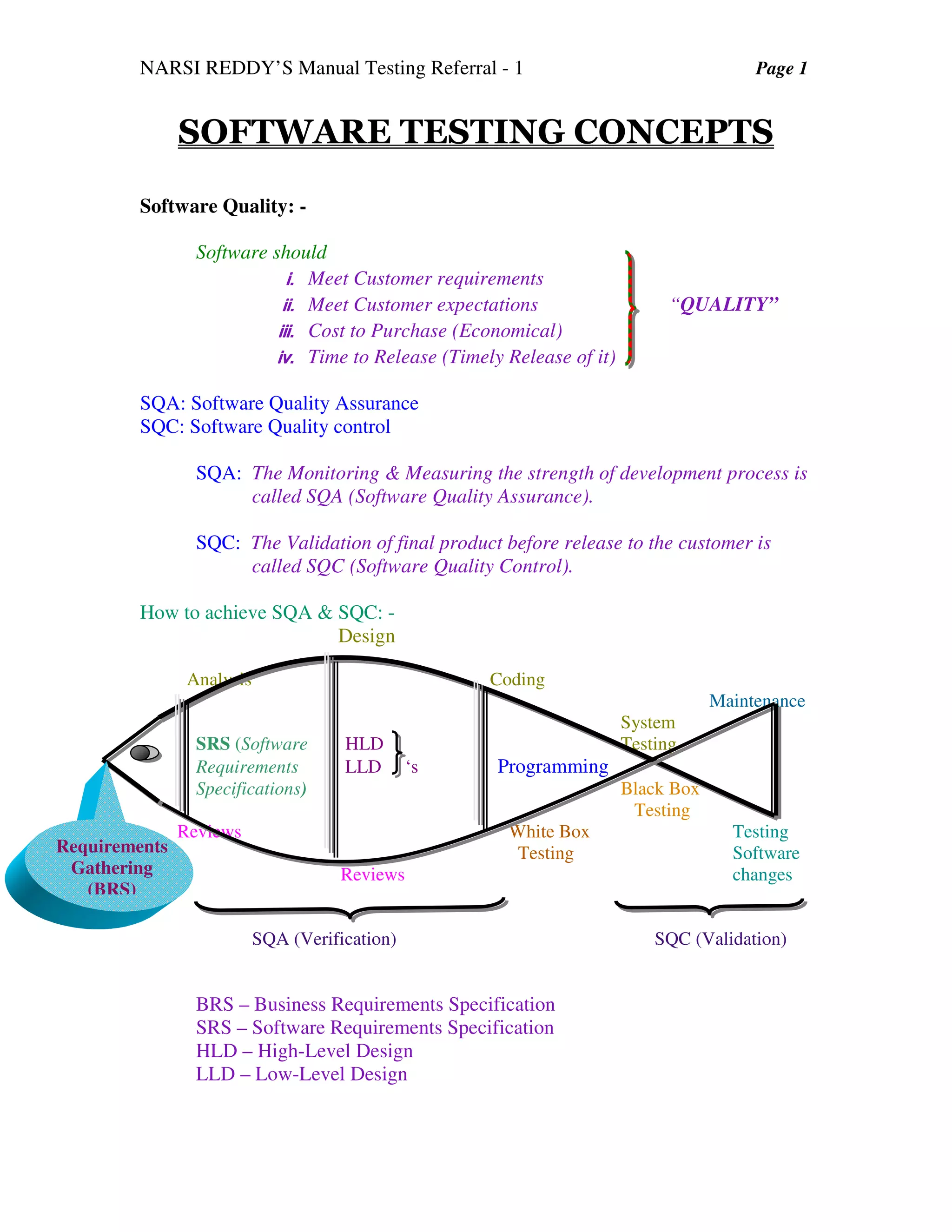 The document discusses key concepts in software testing including software quality, software quality assurance (SQA), software quality control (SQC), and the V-Model. It describes the software development lifecycle including requirements gathering, design, coding, testing, and maintenance. It provides details on different types of testing like unit testing, integration testing, system testing, and reviews/inspections conducted at various stages. Key testing techniques mentioned are black box testing, white box testing, basis path testing, control structure testing, and mutation testing. The V-Model mapping development stages to corresponding testing stages is also explained.
