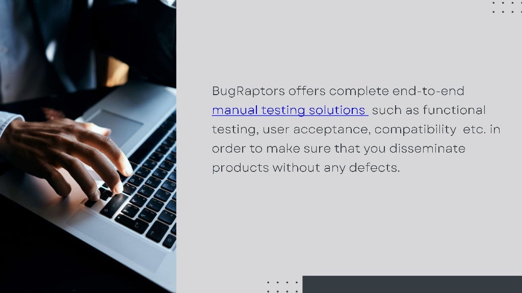 Manual software testing services are preferred by entrepreneurs, as they play a crucial role in delivering high-quality and flawless software solutions. At BugRaptors, we strive to deliver high-quality and reliable manual testing services for our clients globally. Check out the PPT to know more.
