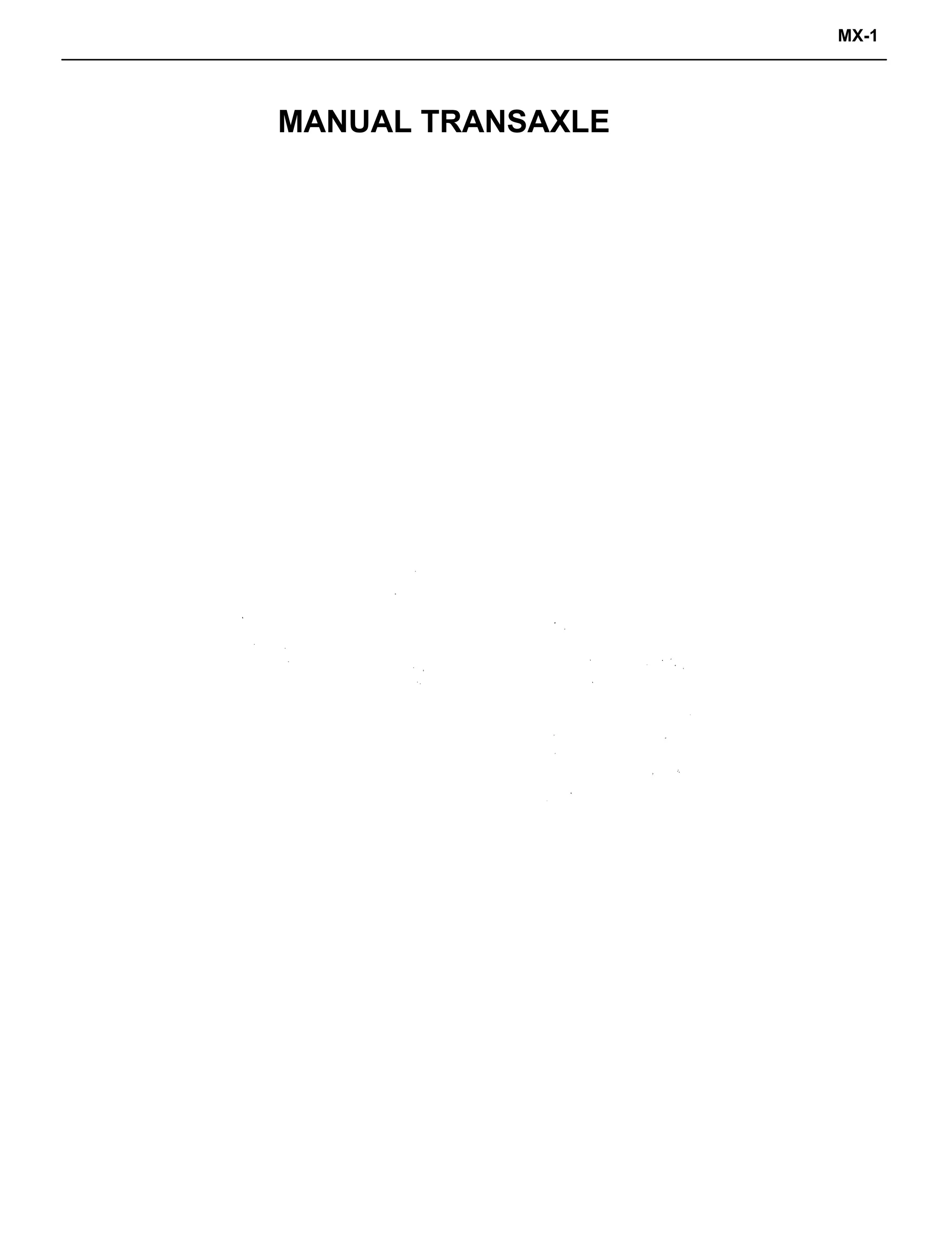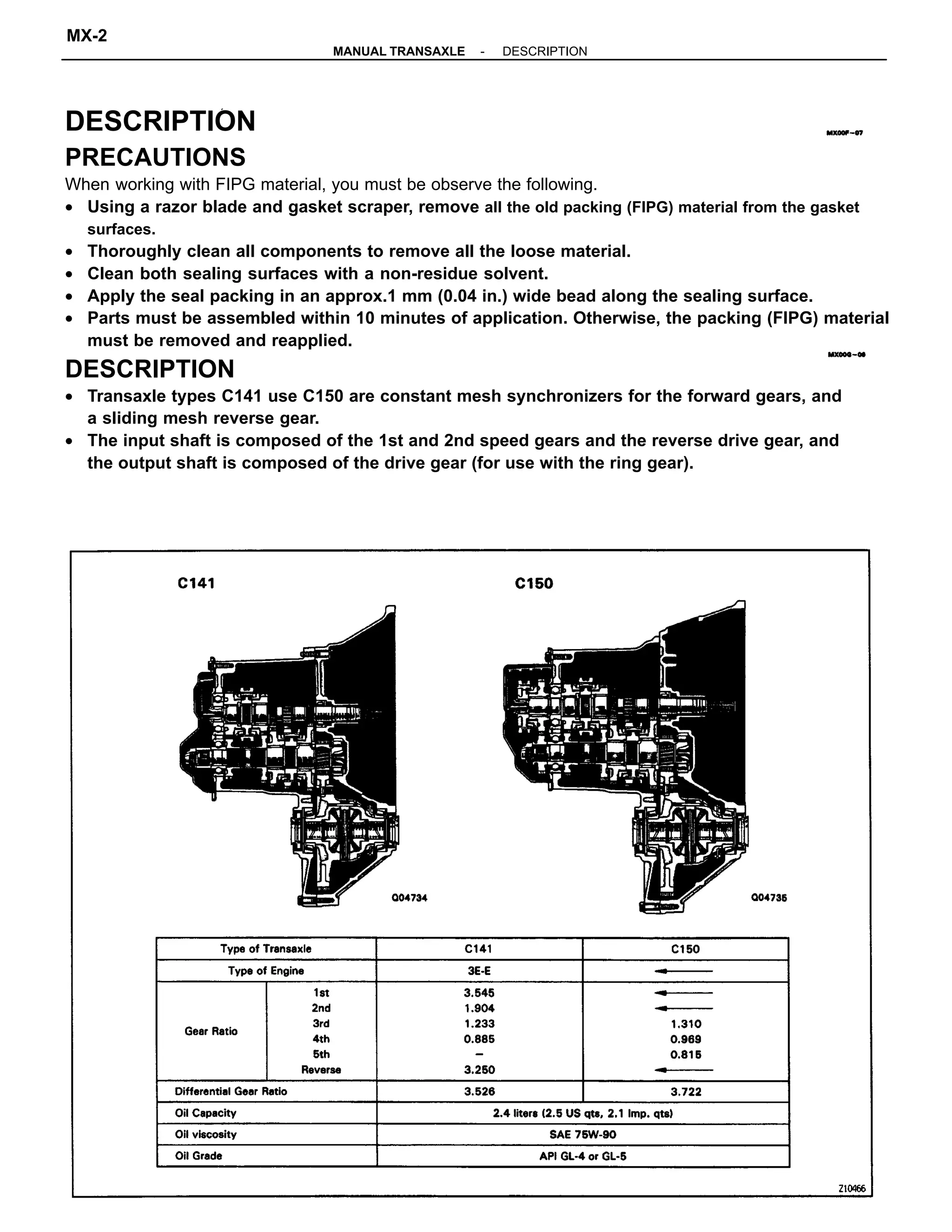 This document provides instructions for servicing a manual transaxle. It describes removing old packing material from sealing surfaces and cleaning components. It also outlines the transaxle types, gear engagements, preparation steps like using special service tools, and removal and installation of the transaxle and various components. Troubleshooting tips are provided in a table listing potential issues and likely causes.
