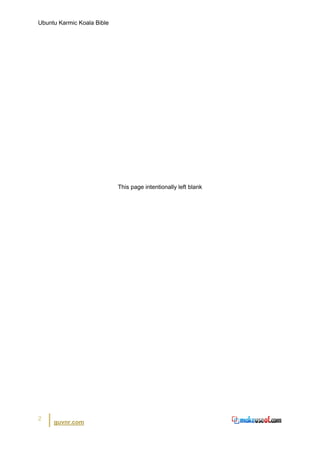 This document provides instructions for installing Ubuntu Karmic Koala. It discusses choosing between the desktop and server editions, dividing the hard drive into partitions before installation, and guiding the user through the installation process. Key steps include downloading the installation ISO, booting from it, choosing a language, and navigating the partitioner. Particular attention is drawn to carefully planning partitions in advance and manually configuring them during installation rather than letting the automatic partitioning take place. Separate partitions are recommended for /home, swap, and backups.